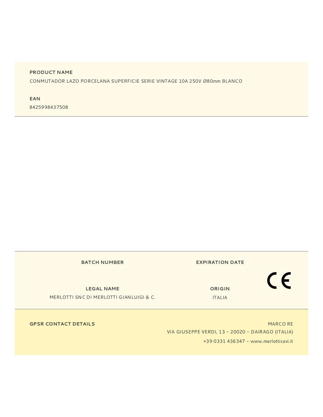 Conmutador lazo porcelana superficie serie vintage 10a 250v ø80mm blanco