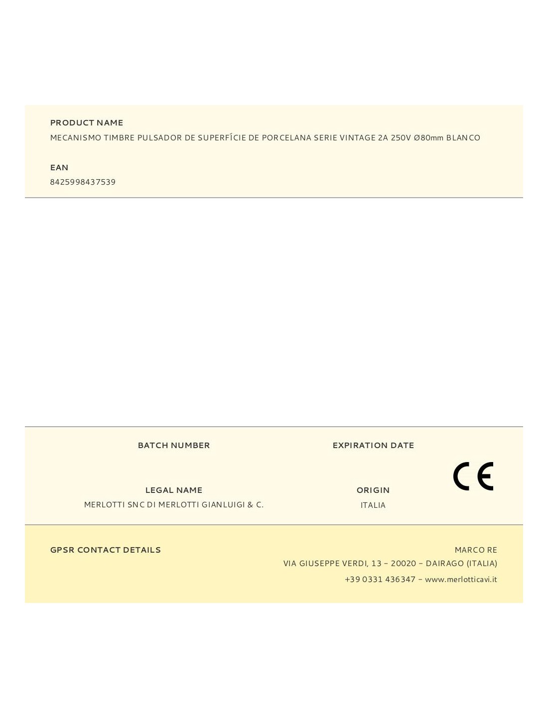 Mecanismo timbre pulsador de superfície de porcelana serie vintage 2a 250v ø80mm blanco