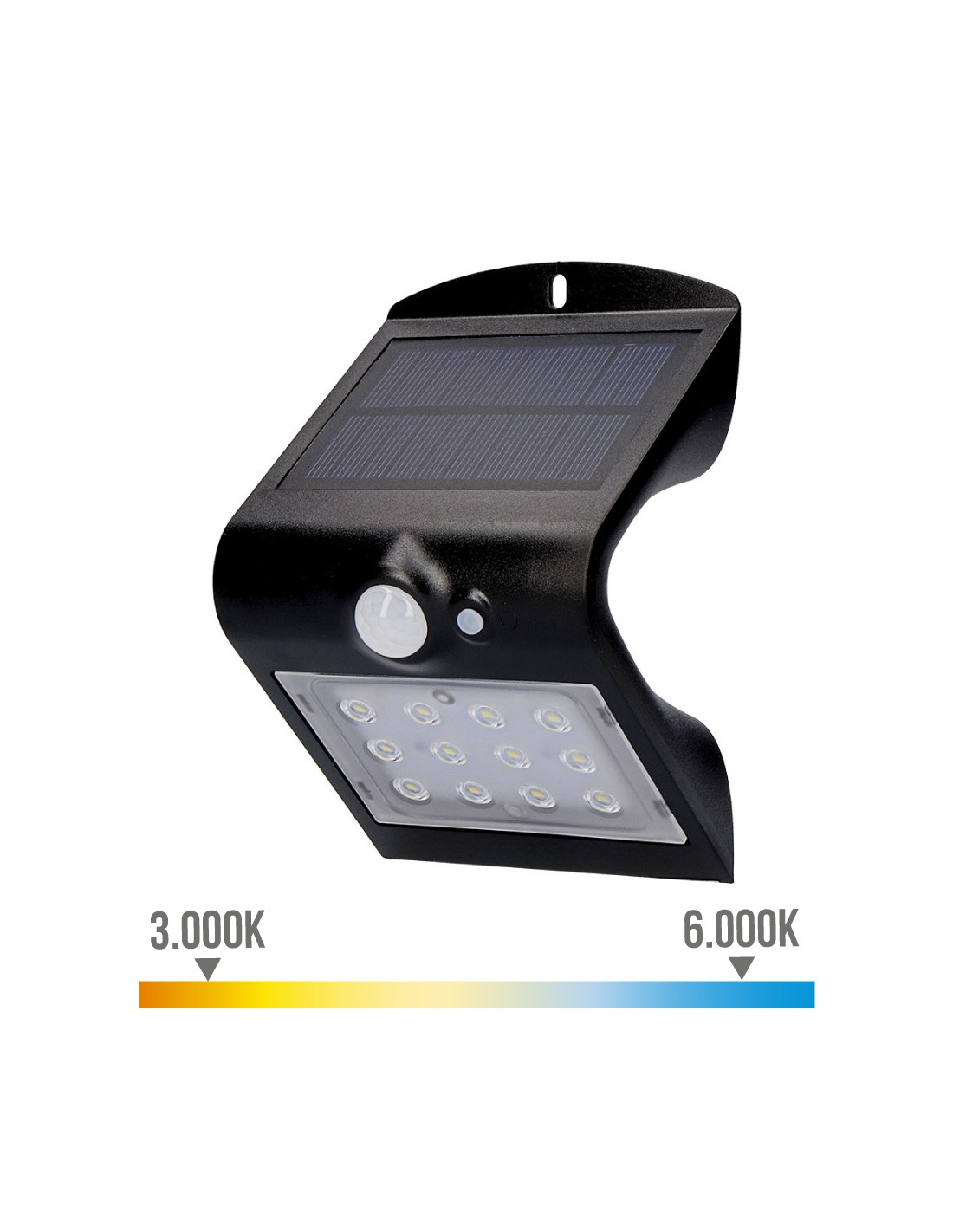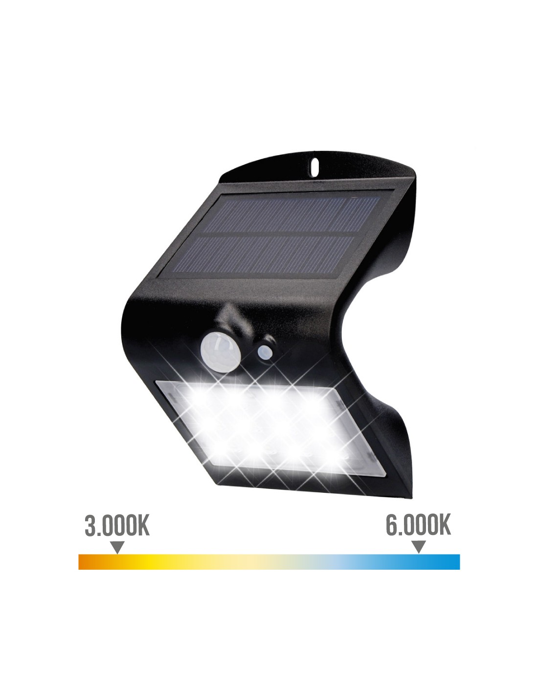 Aplique solar 1,5w 220lm recargable. tiempo recarga 5-6h sensor de presencia (2-6m) doble iluminacion: frontal 6000k (apertura 120°) trasera 3000k uso interior/exterior ip65 color negro edm duracion aprox. 24h medida: 9,6x7,3x14cm