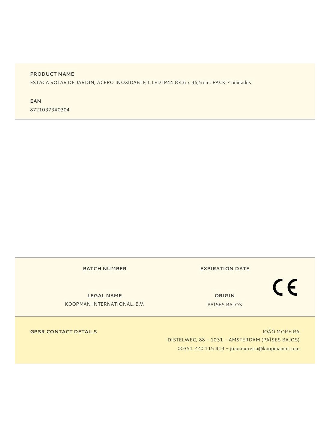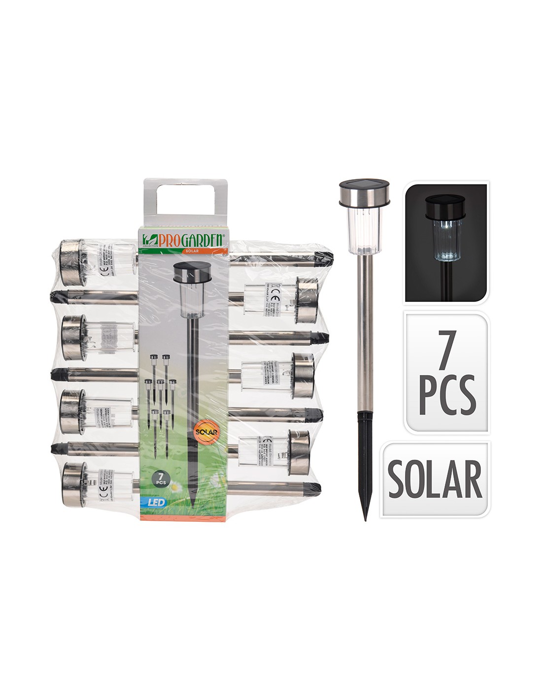 Pack 7 estacas solar de acero inoxidable ø4,6 x 36,5 cm. 1 led luz 4000k con pila de boton recargable. con interruptor.