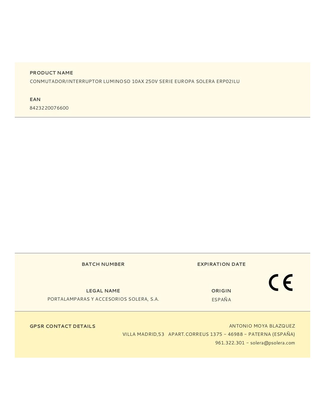 Conmutador/interruptor luminoso 10ax 250v. embornamiento por tornillo. color blanco. contactos de plata de alto poder de ruptura. 83x81x10mm mecanismo completo serie europa solera erp02ilu