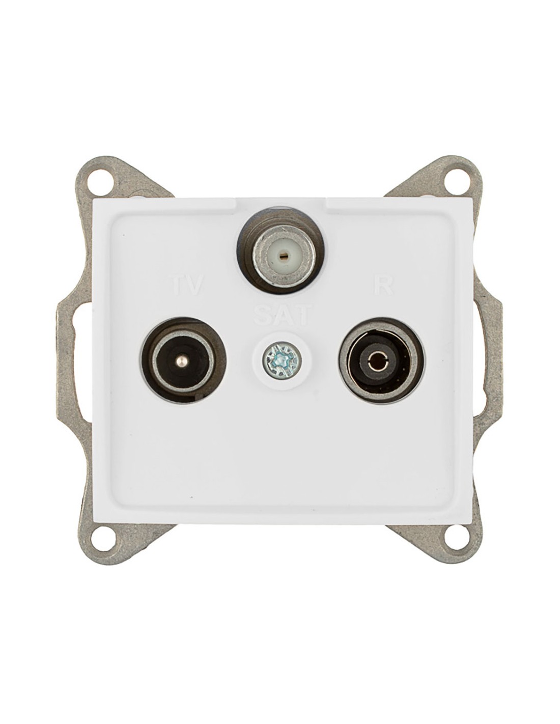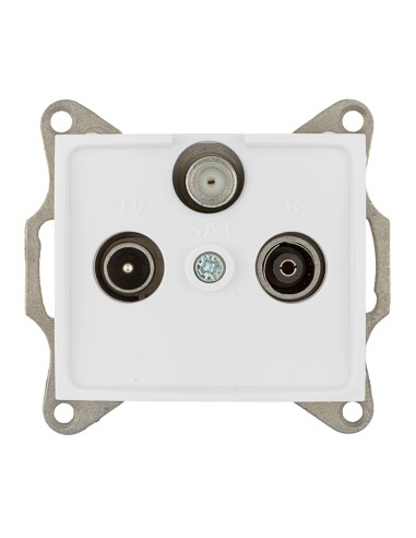 Toma final de satelite, tv y radio. embornamiento por tornillo, de empotrar, color blanco, dispone de entrada unica (necesario instalar con mezclador) contactos de plata de alto poder de ruptura 83x81mm serie europa solera erp48