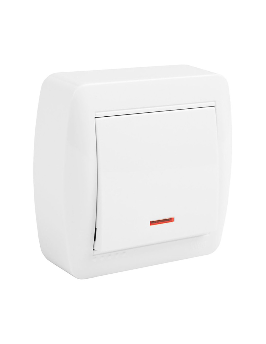 Conmutador unipolar con indicador luminoso 74x72x78mm (ancho/fondo/alto). entradas para minicanal de 10x16mm, 10x20mm y 16x16mm. corriente nominal 10ax 250v mecanismos con tecla basculante y con indicador luminoso. bornes de agujero. contactos de plata de alto poder de ruptura. solera mur02ilu
