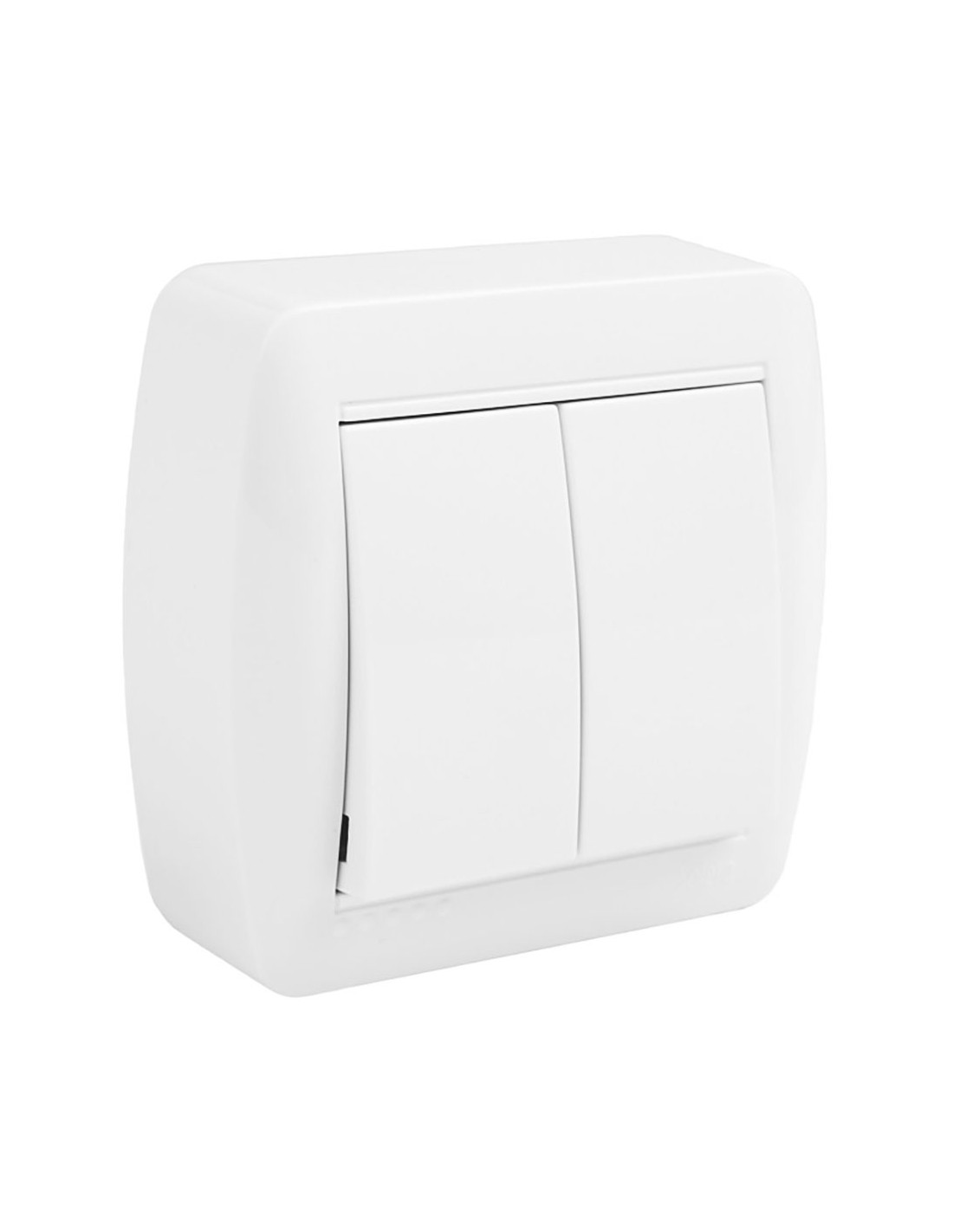 Doble conmutador 74x72x28mm (ancho/fondo/alto). corriente normal 10ax 250v. entradas para canales de 10x12mm, 10x16mm y 10x22mm. contactos de plata de alto poder de ruptura. bornes de agujero superficie mural solera mur12u