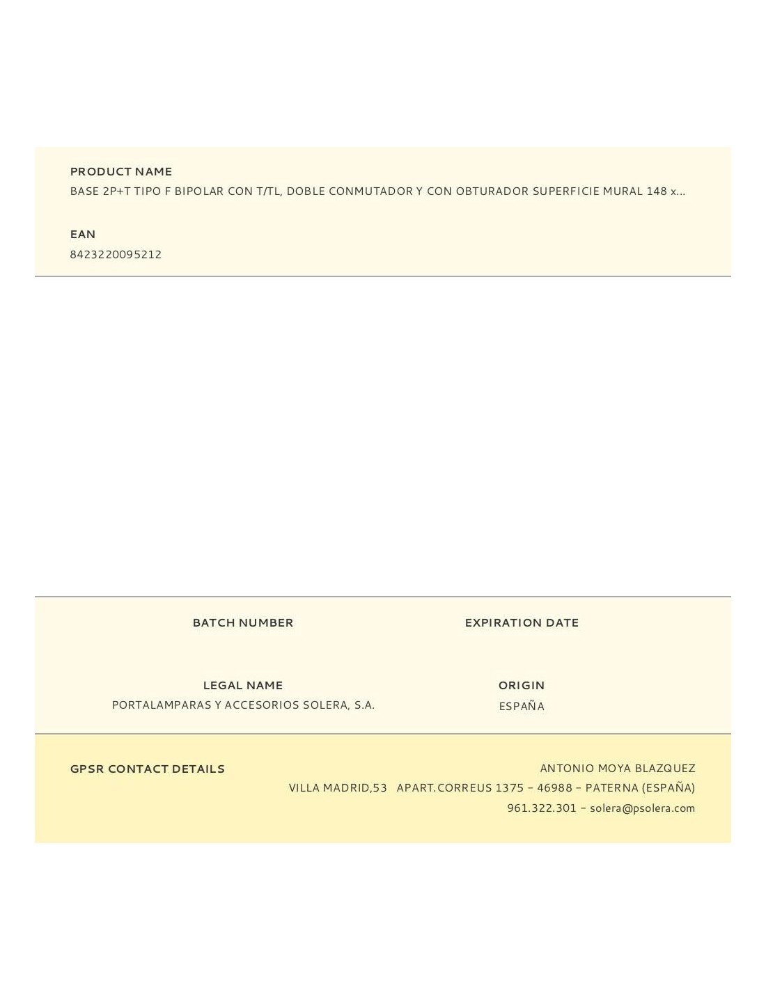 Base 2p+t schuko ø 4,8 mm. bipolar con t/tl, doble conmutador y con obturador 148x72x42mm. corriente normal 10ax 250v. entradas para canales de 10x12mm, 10x16mm y 10x22mm. contactos de plata de alto poder de ruptura. con obturador, bornes de agujero, base con toma francesa. color blanco s. mural solera mur36u