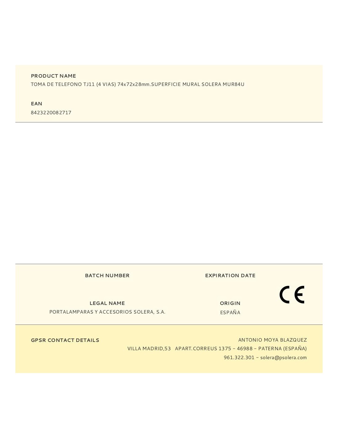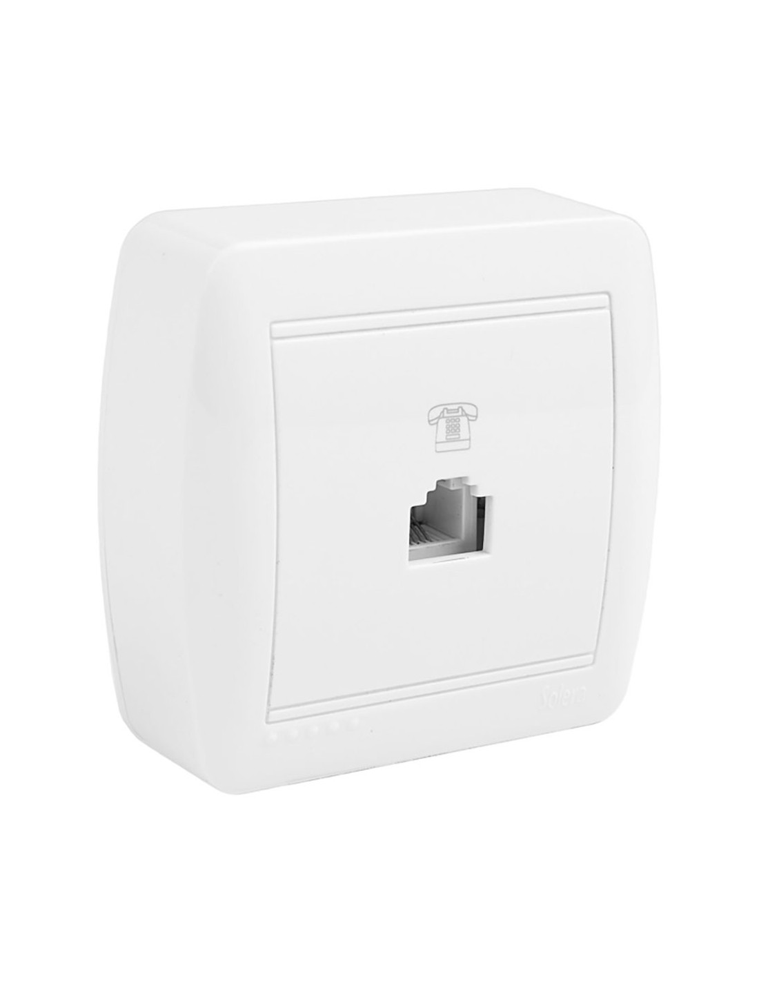 Toma de telefono tj11 (4 vias) 74x72x28mm (ancho/fondo/alto). entradas para canales de 10x12mm, 10x16mm y 10x22mm, bornes de agujero. superficie mural solera mur84u