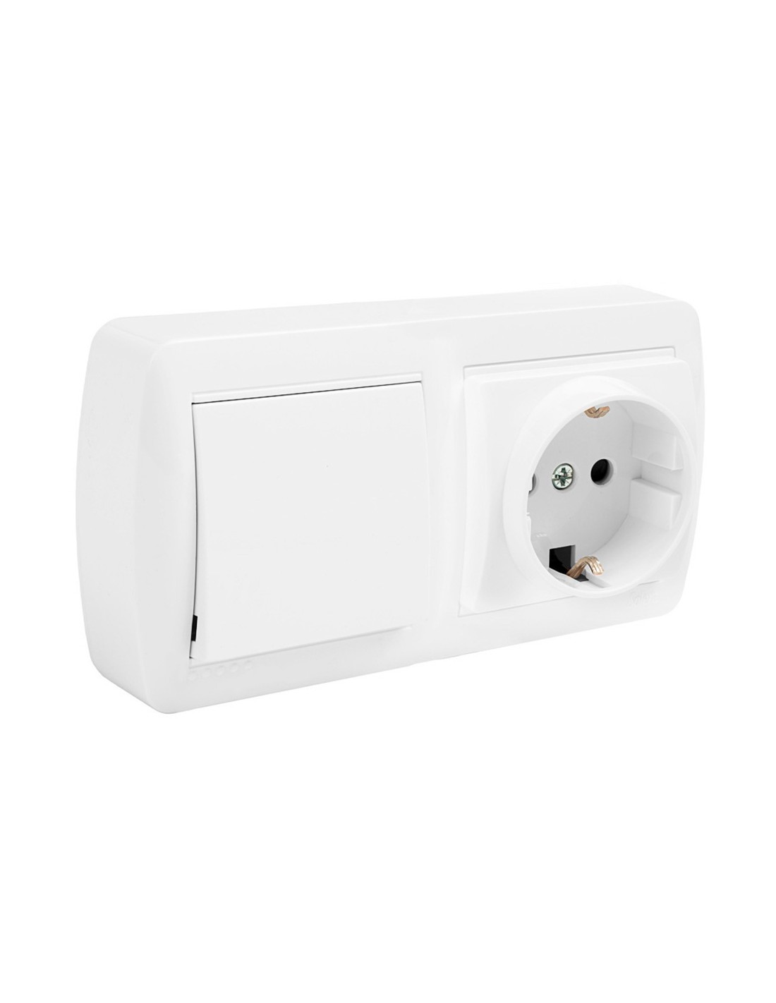Base doble bipolar con t/tl + conmutador de cruce y con obturador 138x42x72mm (ancho/fondo/alto). entradas para canales de 10x12, 10x16 y 10x22, bornes de agujero. con obturador. contactos de plata de alto poder de ruptura. superficie mural solera mur96u