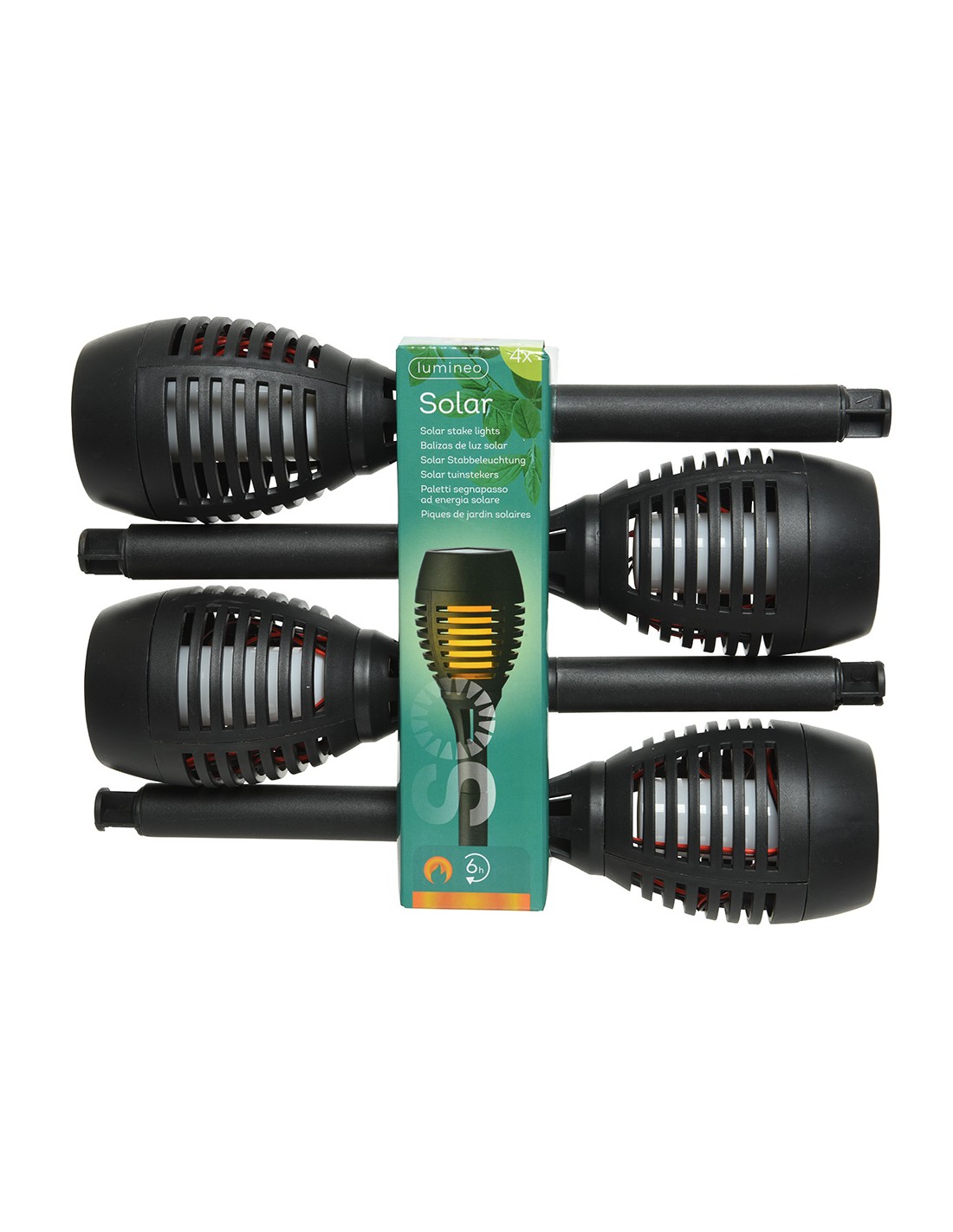 Set de 4 estacas solares efecto llama ø7,5x27cm. bateria ni-mh aaa incluida. 12 leds, con interruptor, 6 horas de funcionamiento. colores/modelos surtidos
