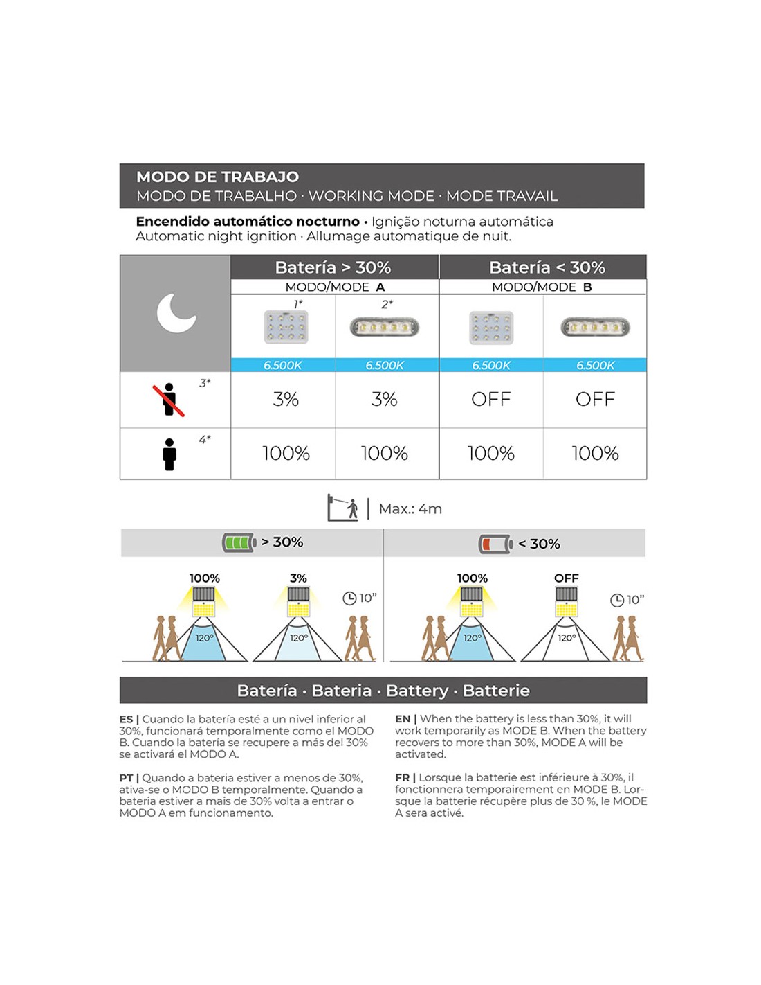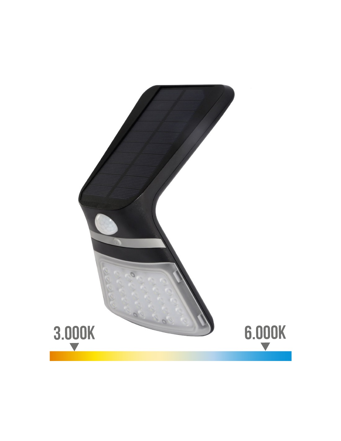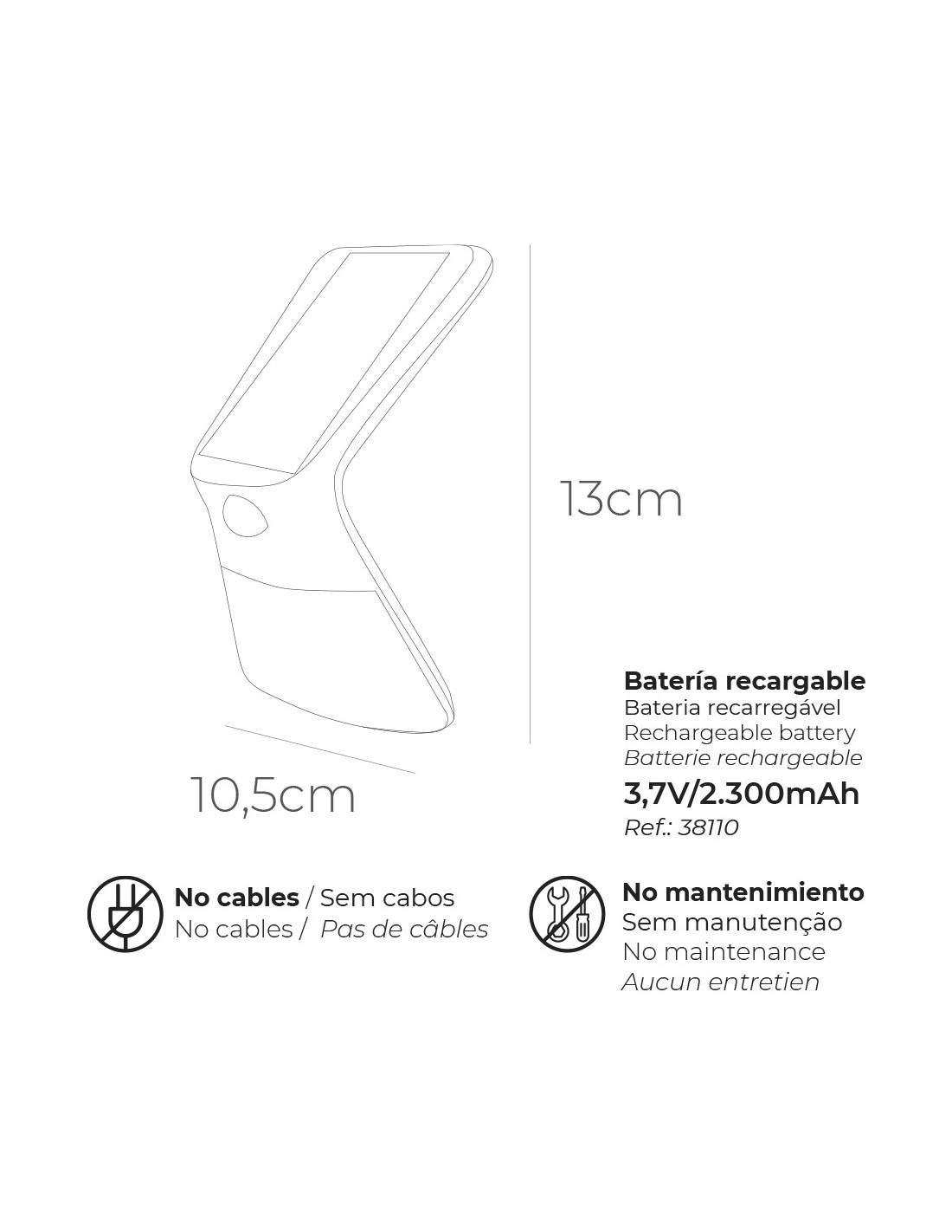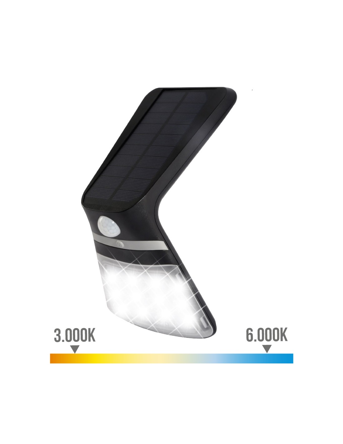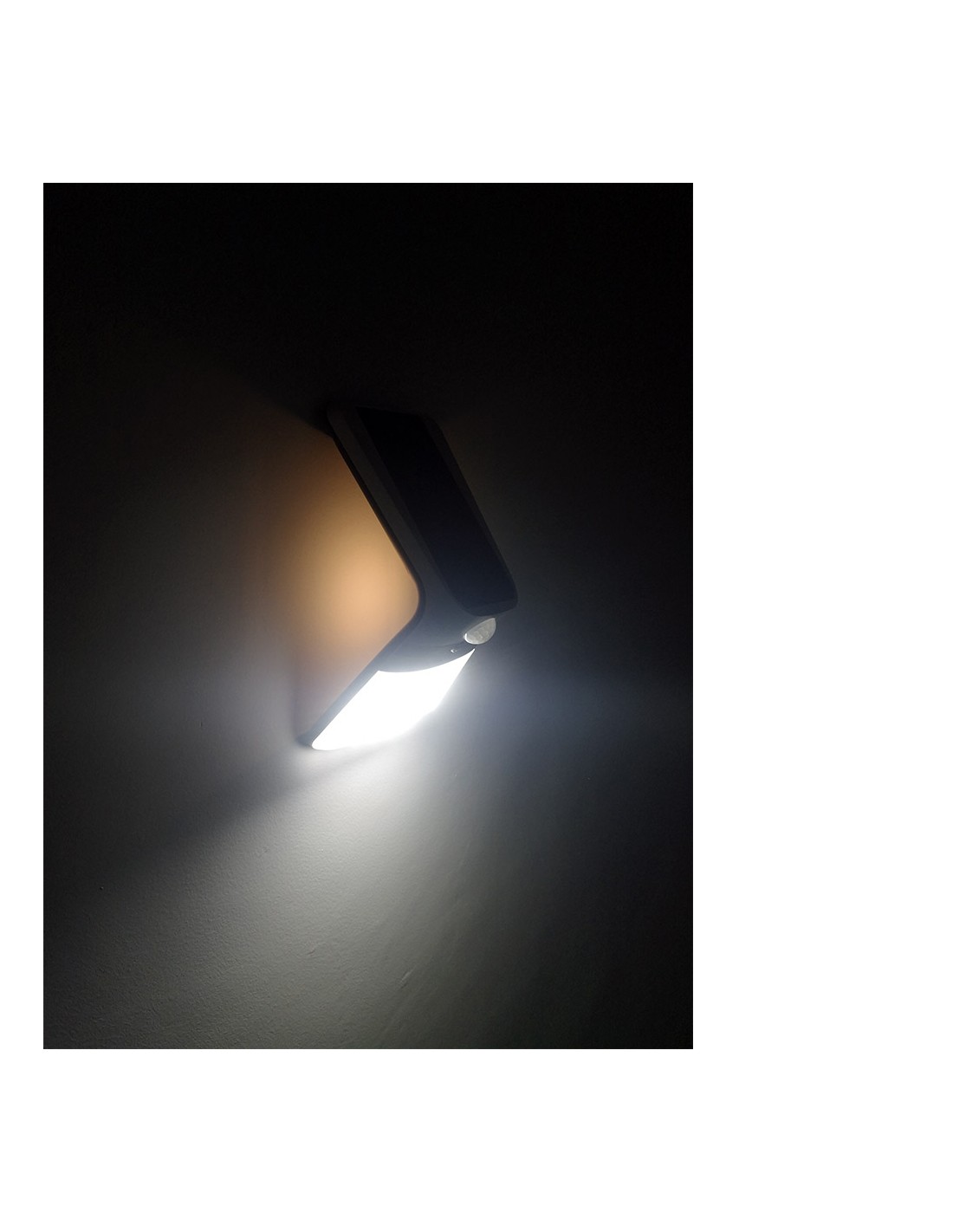 Aplique solar 3,5w 430lm ip65 color negro bateria recargable (3,7v/2300mah ref:38110) sensor presencia (2-8m) 2 tonalidaes de luz (luz frontal 6000k luz fría y luz posterior 3000k luz cálida) encendido automático nocturno, apagado automático durante el dia. 2 modos de iluminación. modo a: sin detectar movimiento 20% encendido luz frontal y 100% encendido luz posterior - con movimiento 100% encendido luz frontal y 100% luz posterior. modo b: sin detectar movimiento apagado luz frontal y 100% encendido luz posterior - con movimiento 100% encendido luz frontal y 100% luz posterior. modo a: se activa automaticamente con carga superior al 30% - modo b :se activa automaticamente con carga inferior al 30% medida: 10,5x13cm edm