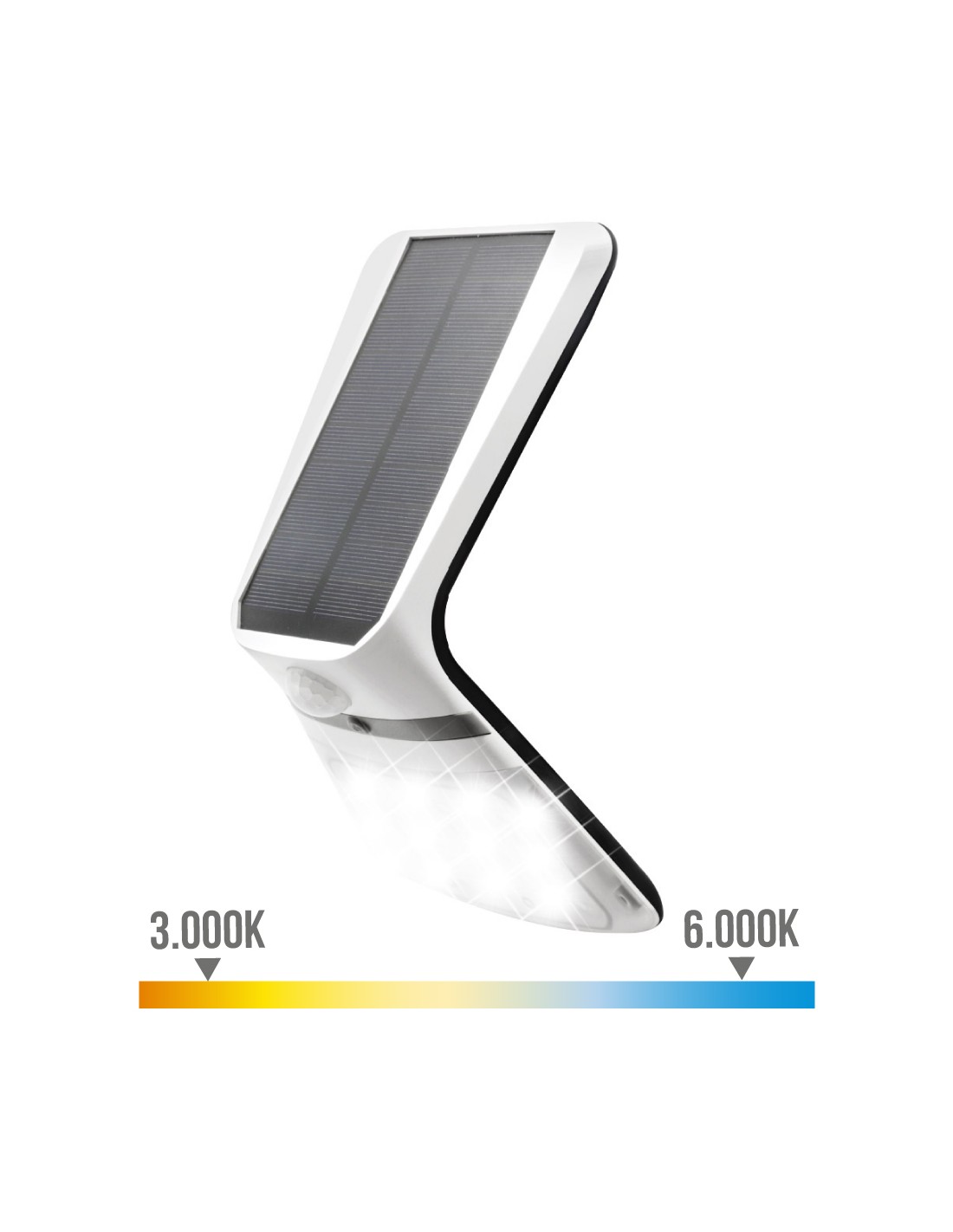 Aplique solar 3,5w 430lm ip65 color blanco bateria recargable (3,7v/2300mah ref:38110) sensor presencia (2-8m) 2 tonalidaes de luz (luz frontal 6000k luz fría y luz posterior 3000k luz cálida) encendido automático nocturno, apagado automático durante el dia. 2 modos de iluminación. modo a: sin detectar movimiento 20% encendido luz frontal y 100% encendido luz posterior - con movimiento 100% encendido luz frontal y 100% luz posterior. modo b: sin detectar movimiento apagado luz frontal y 100% encendido luz posterior - con movimiento 100% encendido luz frontal y 100% luz posterior. modo a: se activa automaticamente con carga superior al 30% - modo b :se activa automaticamente con carga inferior al 30% medida: 10,5x13cm (ancho/fondo/alto) edm