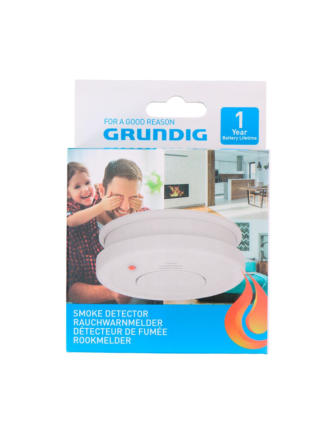 Detector optico de humo grundig. tamaño 34x101x101mm, funciona con una pila 9v incluida. 85db, para aprox. una estancia de 20-40m