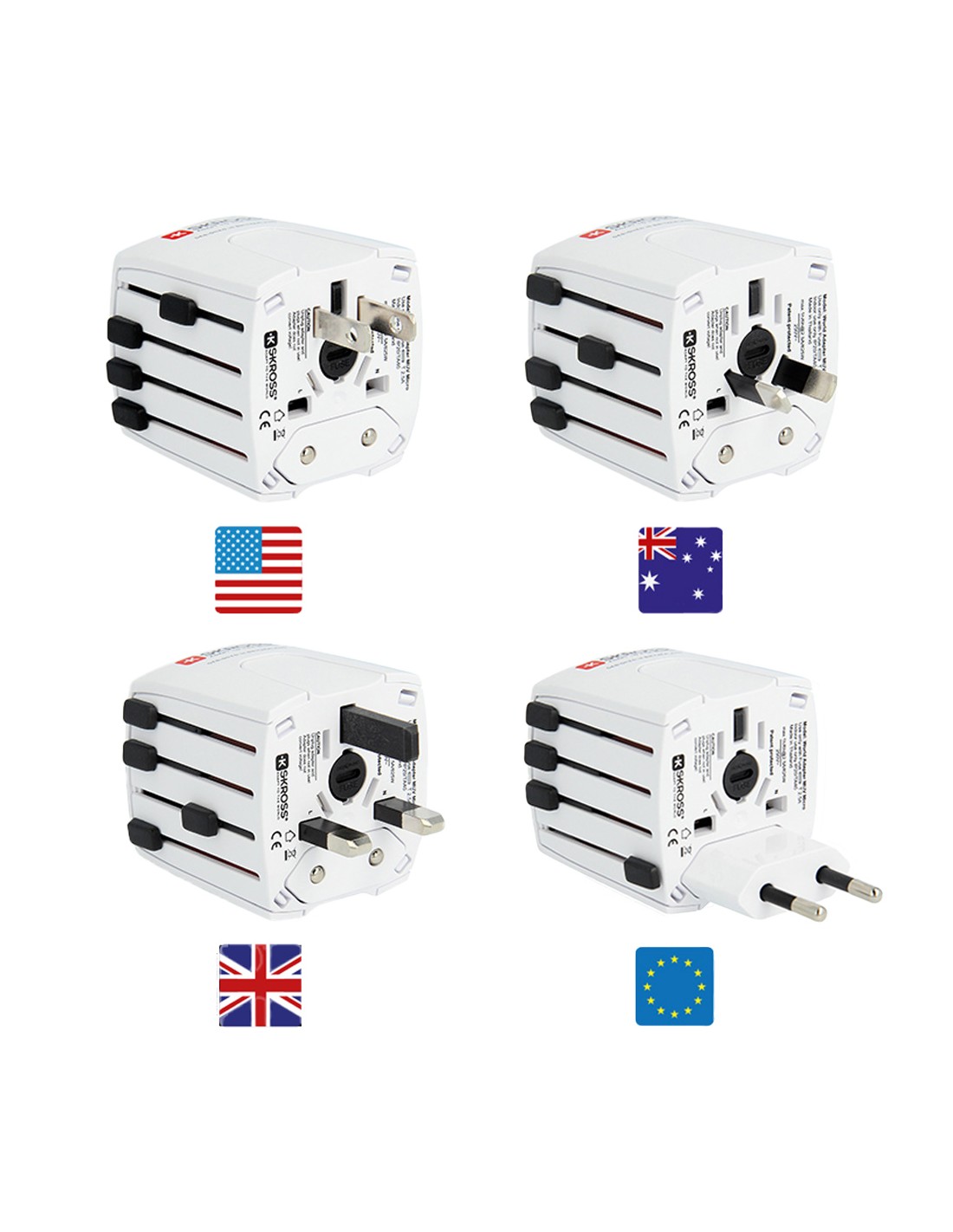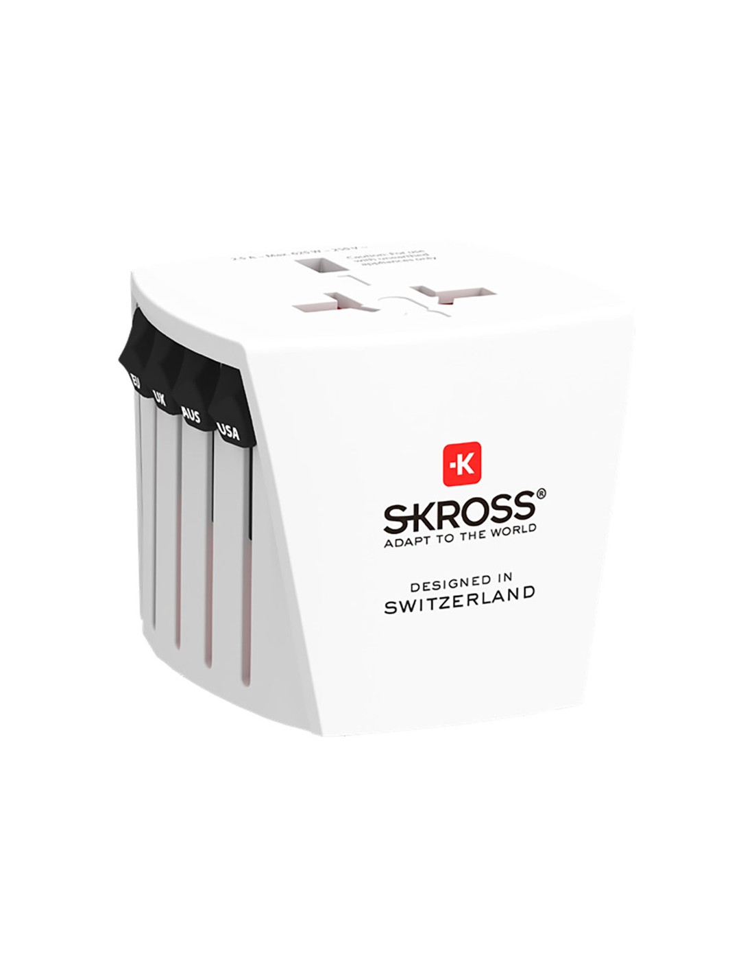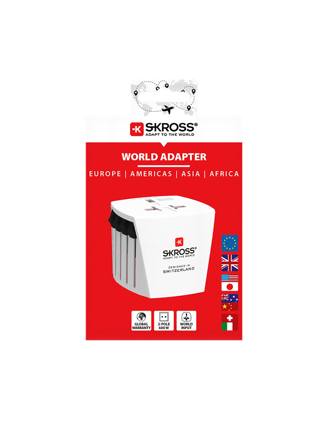 Multi adaptador de viaje skross 1302180. 100v-250v. diseñado en suiza, ideal para aparatos sin toma de tierra, entrada: europa, australia/china, reino unido, estados unidos/japón. salida: europa, australia/china, reino unido, estados unidos/japón. voltaje de entrada: 100v-250v. máx carga 2,5a. 100v-250w 250v-625w, fusible reemplazable, no convierte el voltaje.