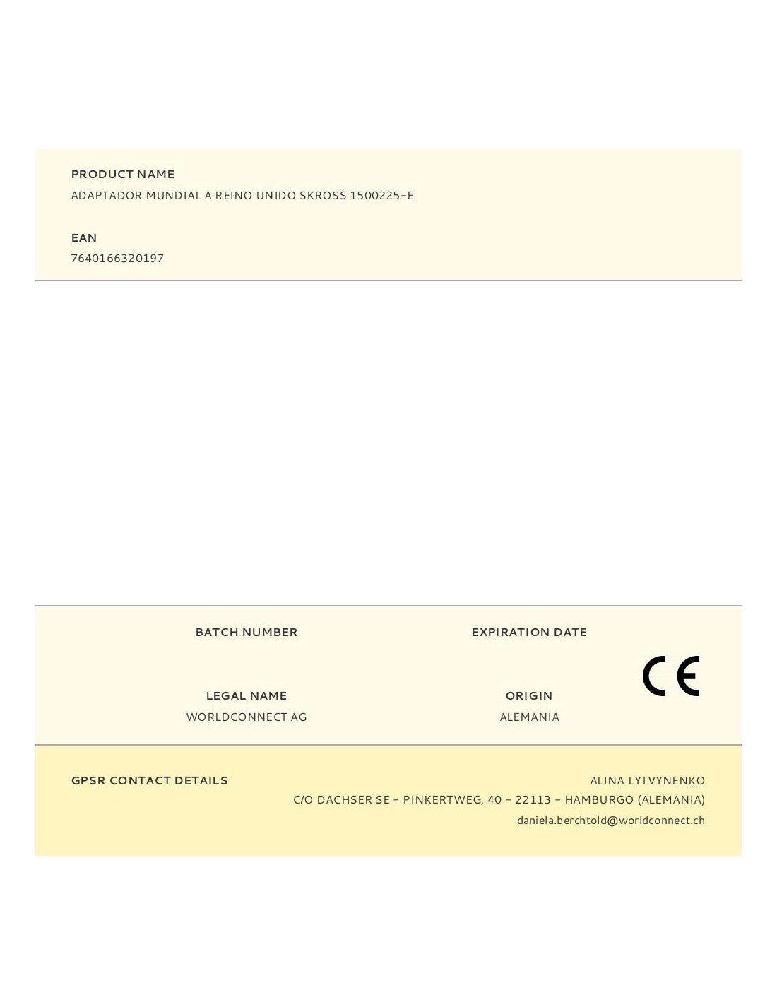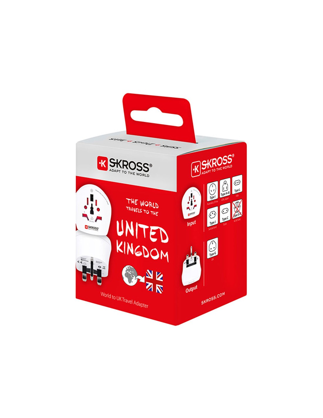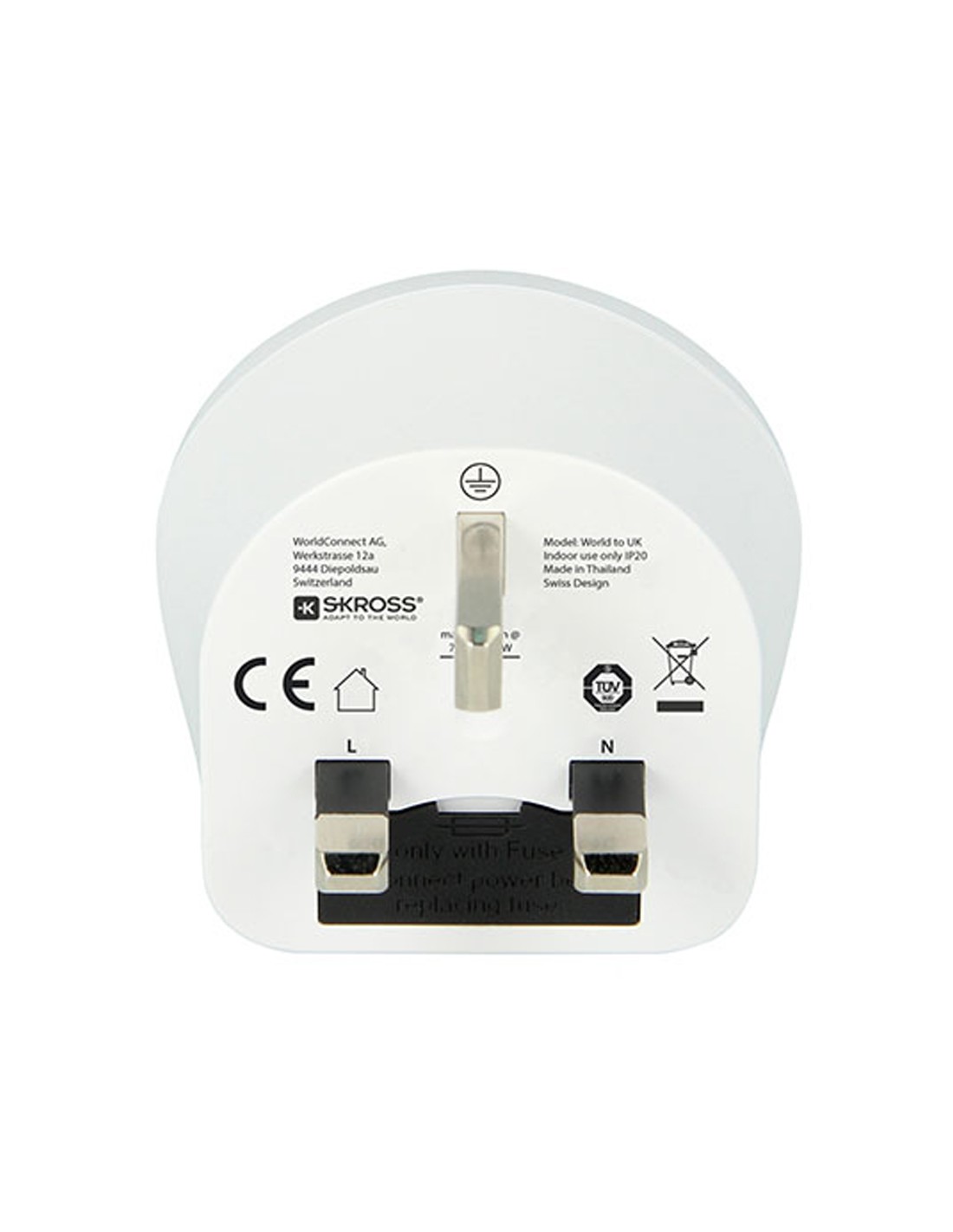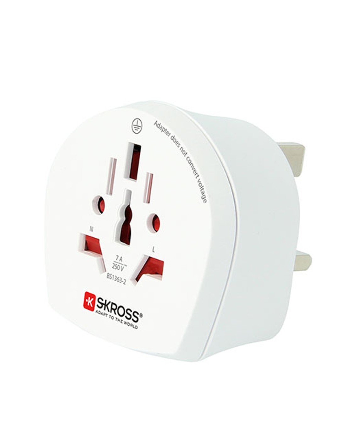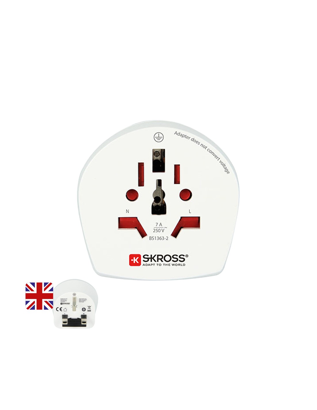 Adaptador mundial a reino unido skross 1500225-e. diseñado en suiza. adecuado para equipos con enchufes con y sin tierra (2 y 3 polos). entrada: suiza, italia, brasil, estados unidos/japón, australia/china, europa. salida: reino unido. tensión de entrada: 100v/250v. máx. carga: 7a. potencia nominal: p. ej. 100v/700w 250v/1750w. fusible reemplazable: t 7a. no convierte voltaje. no apto para dispositivos con enchufe 2p+t schuko