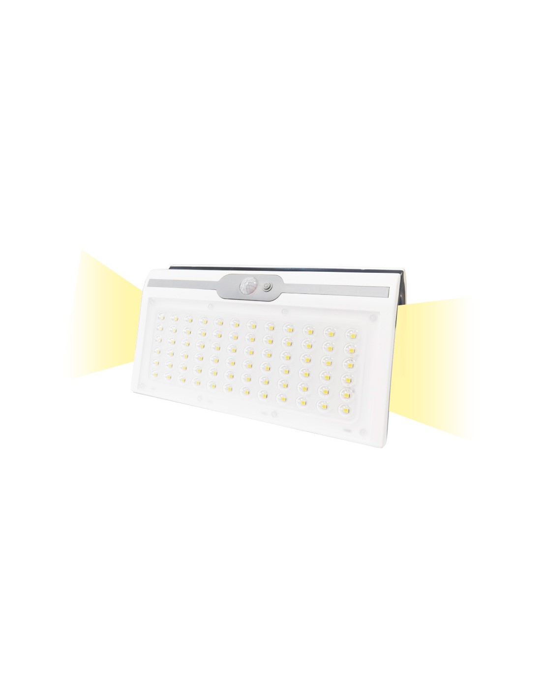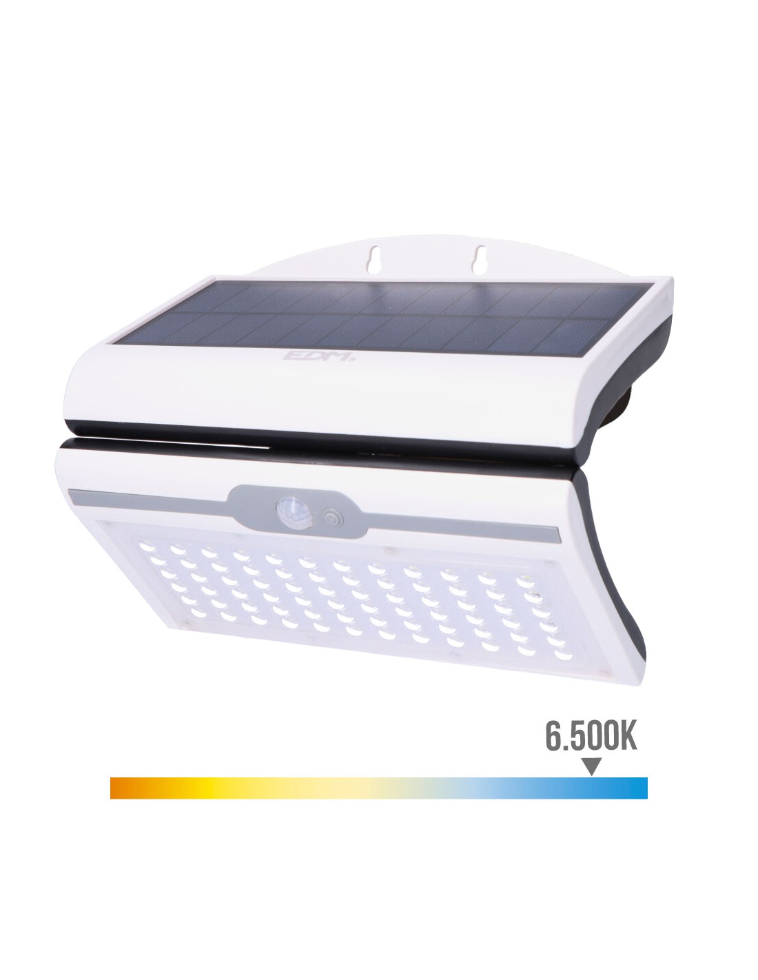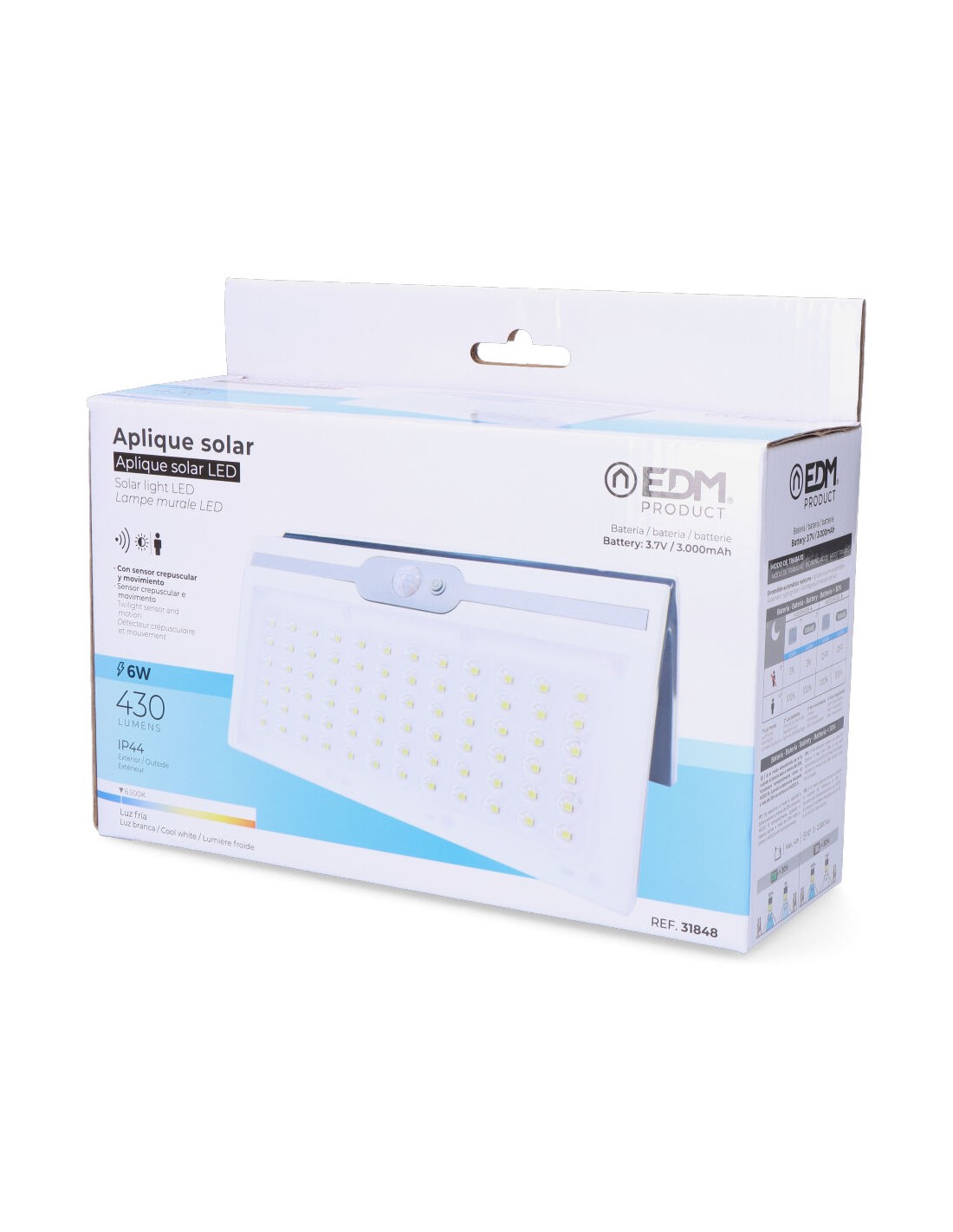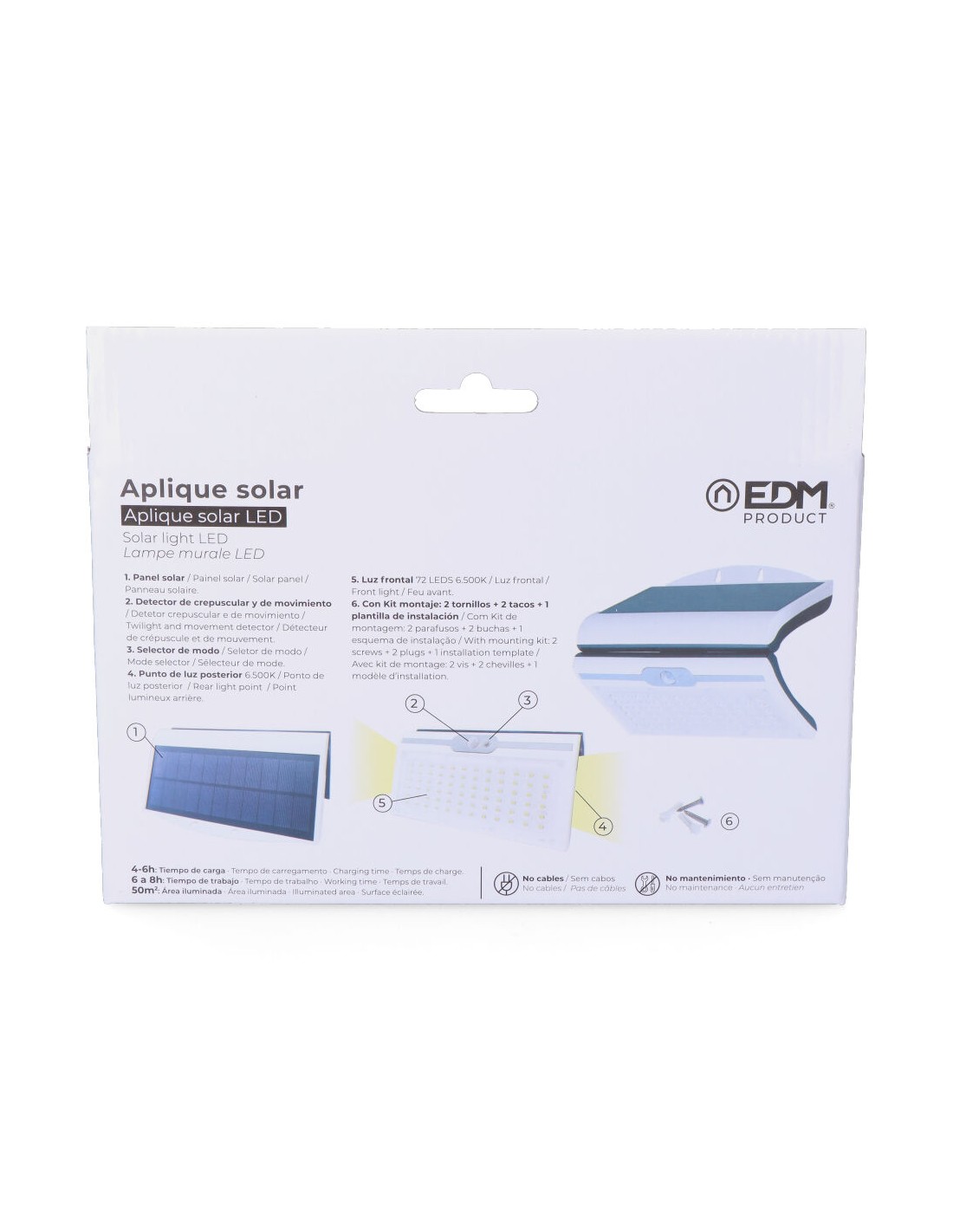 Aplique solar 6w 430lm 6.500k con sensor color blanco edm. 72 leds. panel solar 6v 6w policristalino, incluye batería de litio de 1500 mah 18650. tiempo de carga 4-6 horas, tiempo de funcionamiento 6-8 horas. dimensiones: 23x10,5x18,5cm. ip44. funcionamiento: cuando la batería esté a un nivel inferior al 30%, funcionará temporalmente como el modo b. cuando la batería se recupere a más del 30% se activará el modo a.