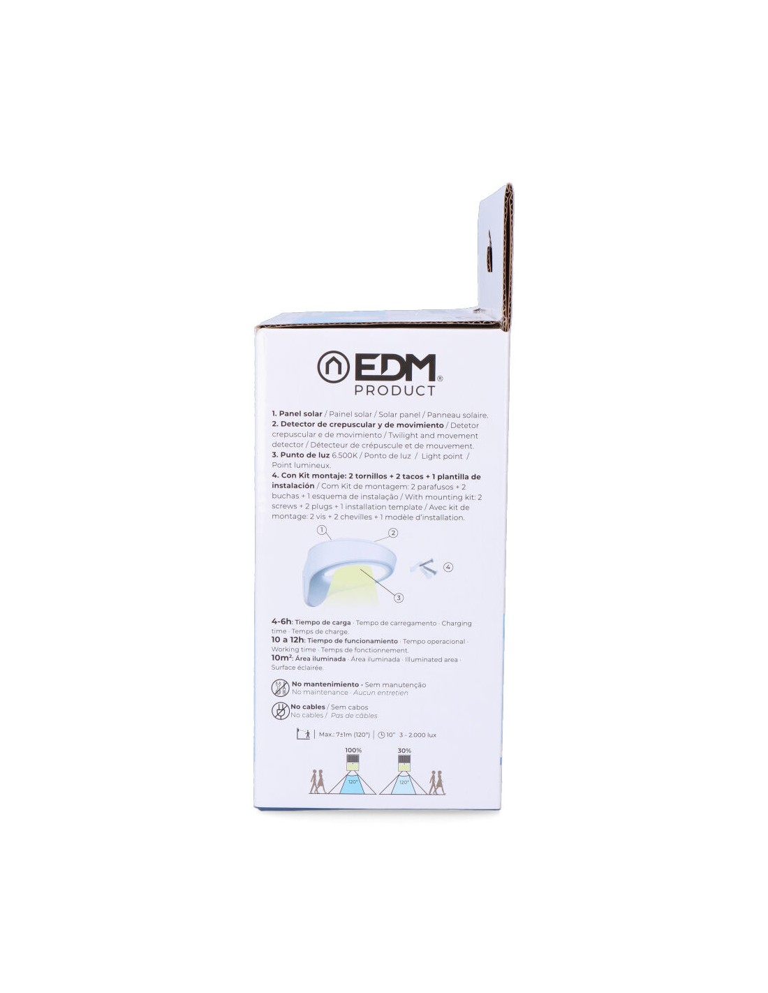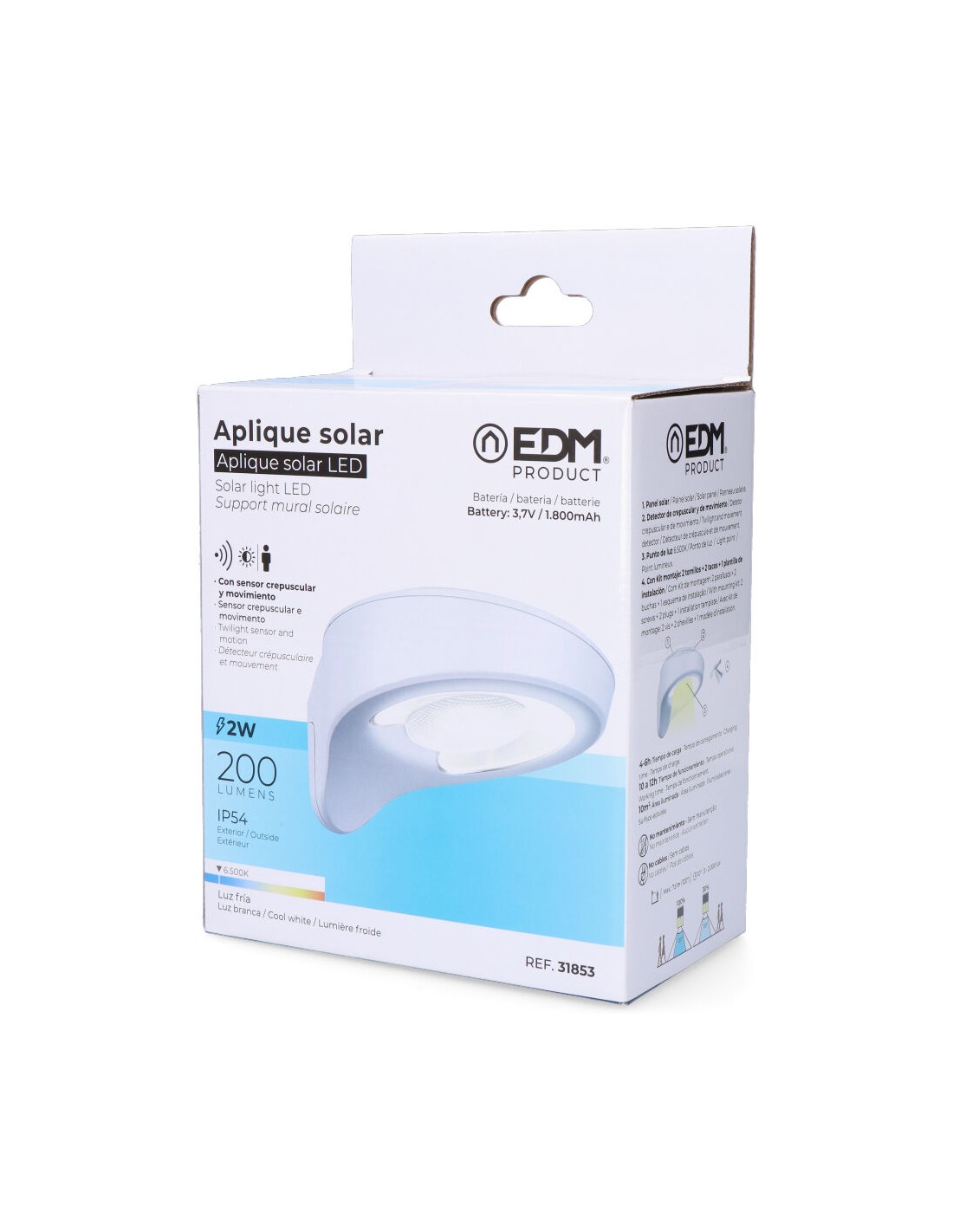 Aplique solar 2w 200lm 6500k con sensor color blanco edm. 31 leds. panel solar 3,7v 2w policristalino, incluye batería de litio de 1800mah 18650. tiempo de carga 4-6 horas, tiempo de funcionamiento 10-12 horas. dimensiones: 17x15,3x9,2cm. ip44