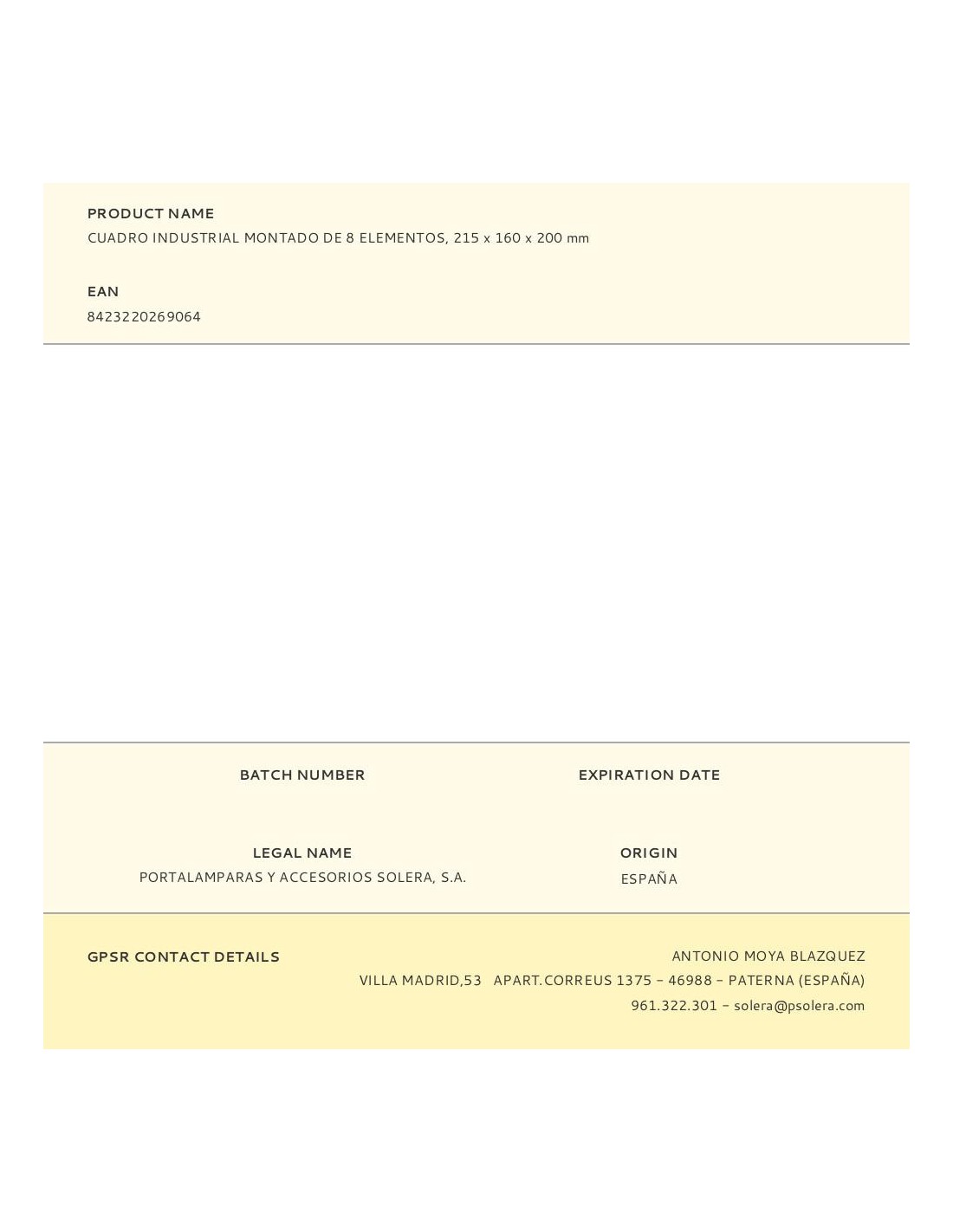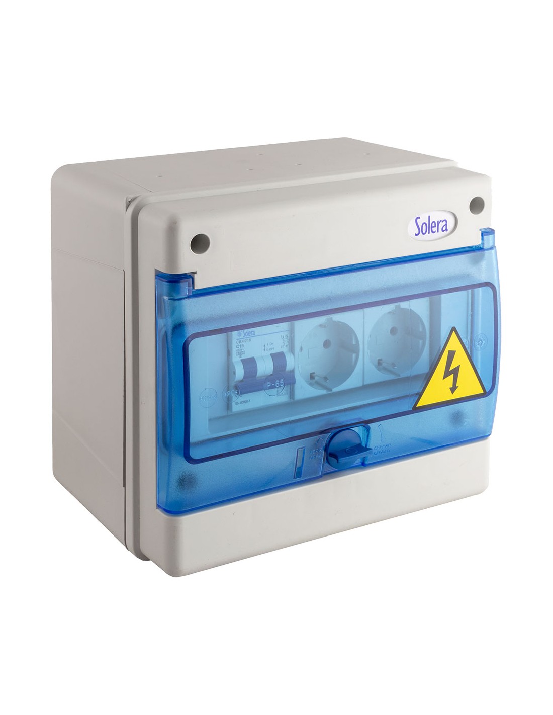 Cuadro industrial montado de 8 elementos. 215x200x160mm (ancho/fondo/alto) 1308a-c9 solera montaje indubox ref.1308a. componentes: 2 bases 2p+t 16a 1 magnetotérmico 2p, 16a. poder de corte 6 ka.
