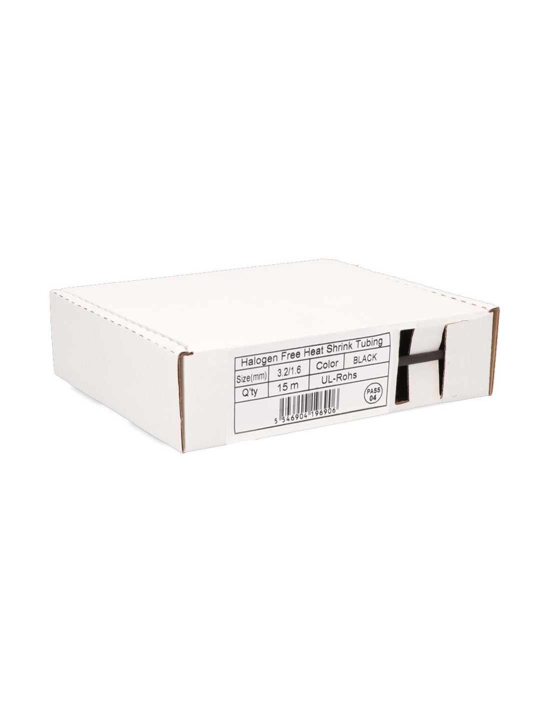 Caja termoretractil dosificadora ø3,2 - 1,6 mm 15m. caja dosificadora neutra termo-retractil ø3,2 - 1,6 mm color negro 15m. primera medida antes de contraer y la segunda máxima contracción tras calentado.