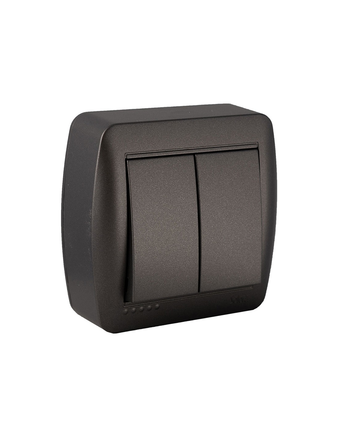 Doble conmutador 10ax 250v~. de superficie. serie mural doble conmutador 10ax 250v~. embornamiento por tornillo.de superficie. color grafito. dimensiones 74x72x28 mm. entradas para minicanal de 10x16, 10x20 y 16x16 mm.