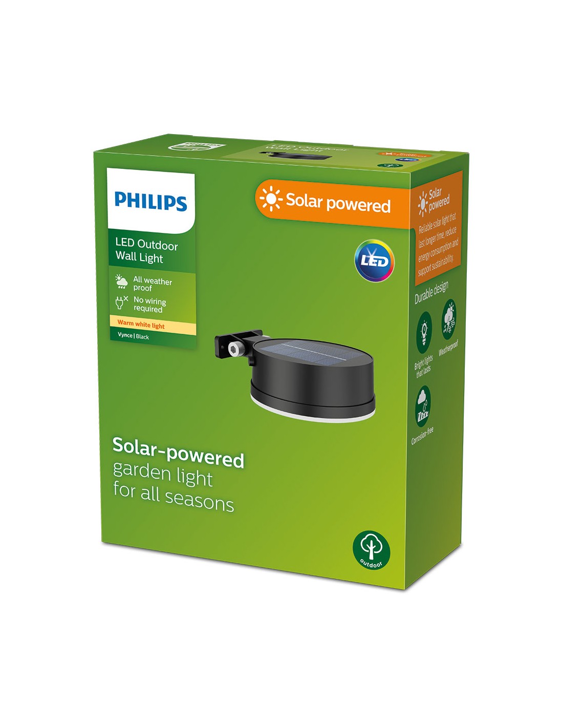 Aplique solar vynce redondo, ip 44 1,5w, 200im 2700k, luz cálida, medidas: 11,2x4,6x14,1cm, tipo de flujo 360°, horas de funcionamiento 15.000h aprox. philips