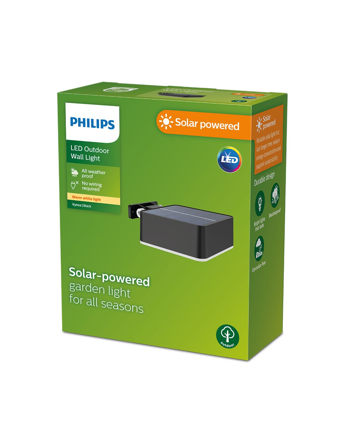 Aplique solar vynce cuadrado, ip 44 1,5w, 200im 2700k, luz cálida, medidas: 10,5x4,6x13,6cm, tipo de flujo 360°, horas de funcionamiento 15.000h aprox. philips