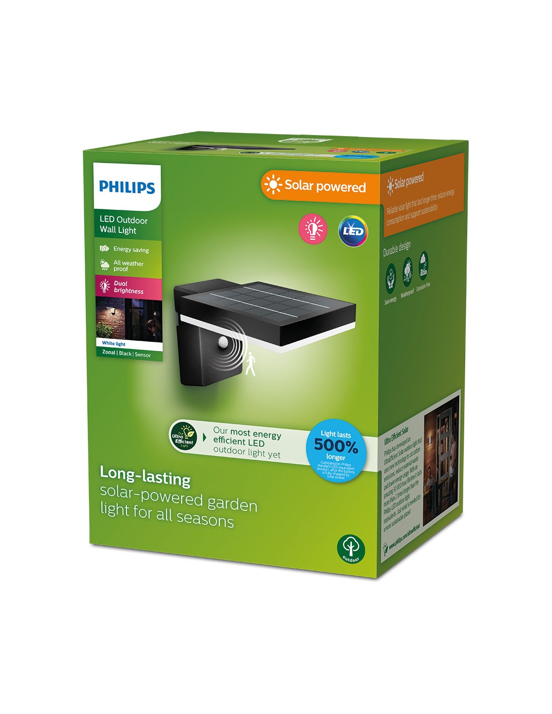Aplique solar mural cuadrado ultraeficiente,ip44 1,3w, 250im 3000k, luz cálida, medida: 16x13,5x20,6cm, horas de funcionamiento 50.000h aprox. philips