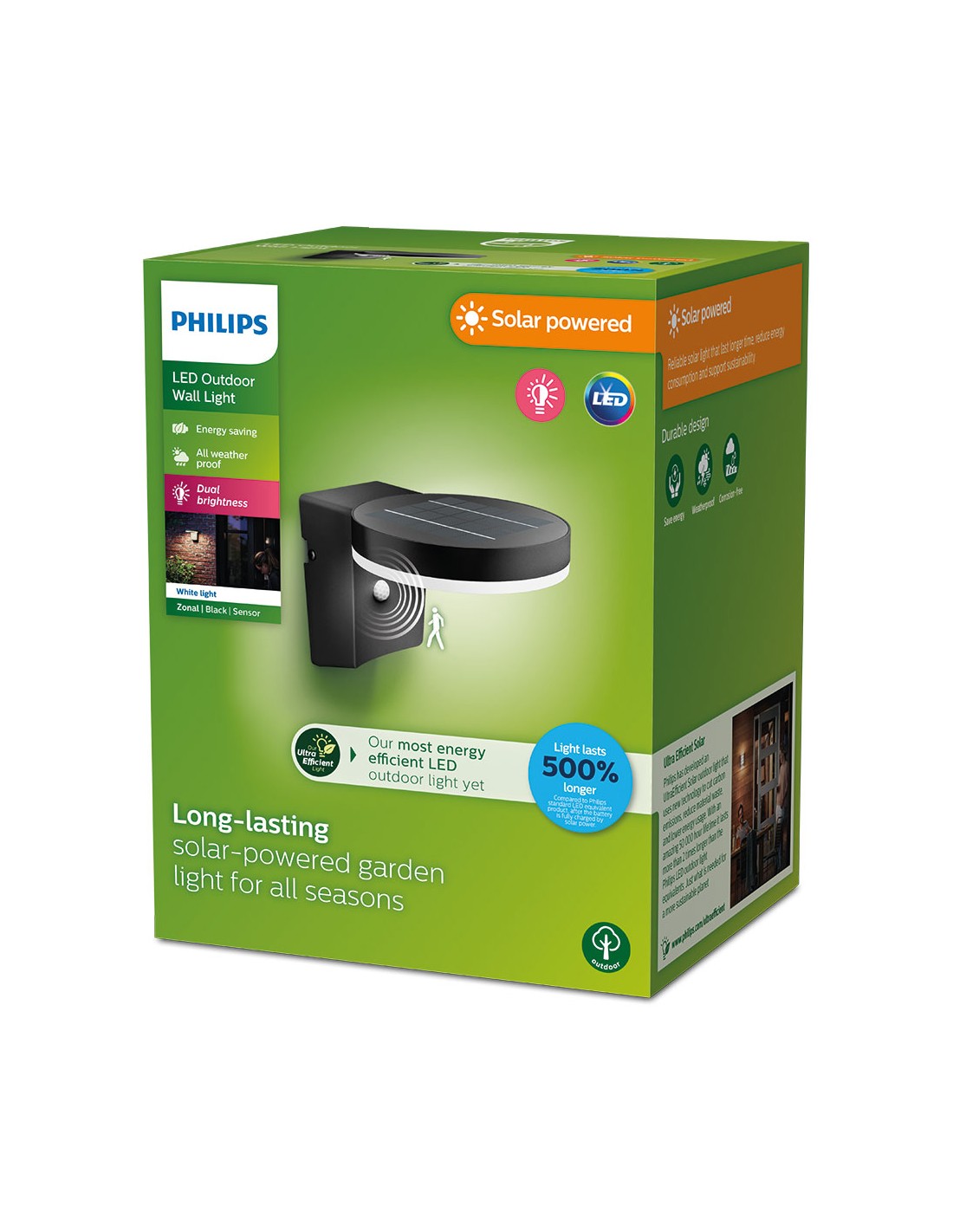 Aplique solar mural redondo ultraeficiente,ip44 1,3w, 250im 3000k, luz cálida, medida: 16x13,5x20,3cm, horas de funcionamiento 50.000h aprox. philips