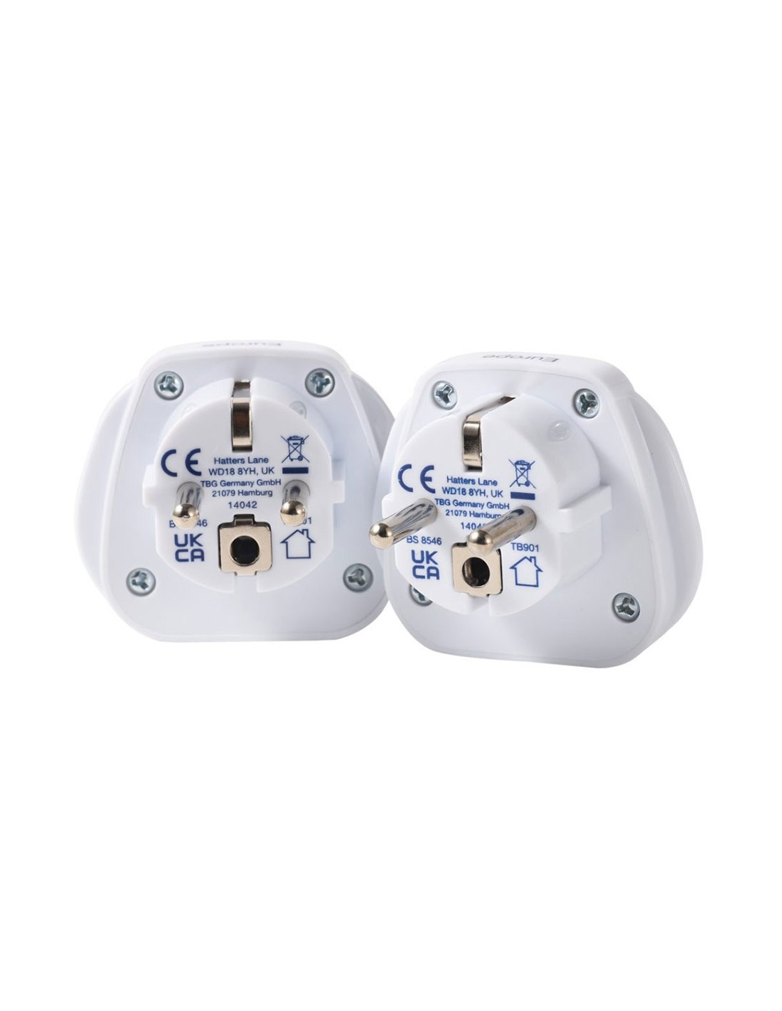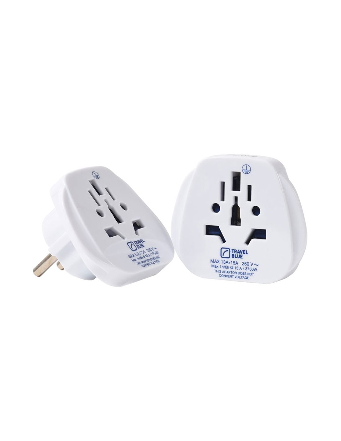 Pack de 2 adaptadores entrada multiple mundial a salida clavija europa, tb-902 conecta de manera segura con la mayoria de enchufes (excluyendo india, sudafrica y enchufes 2p+t schuko), con toma de tierra para mayor seguridad,permite a viajeros de 150 países conectar sus aparatos electrónicos (excluyendo suiza, italia, dinamarca y reino unido). este adaptador no convierte voltaje. potencia máx: 10a (1100w a 110v/ 2200w a 220v). travel blue