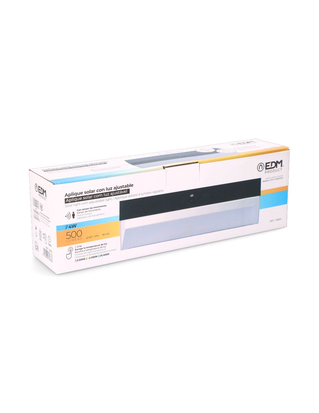 Aplique solar 4 w, 500 lm, 96 led, temperatura de luz ajustable 3.000 / 4.000 / 6.500 k, 3cct, con sensor de movimiento y crepuscular, 3 modos de funcionamiento, rectangular. panel solar 1,5 w policristalino, incluye batería de litio de 2.000 mah 3,7 v (reemplazable). tiempo de carga: 6-8 horas, tiempo de funcionamiento: 8-12 horas, 15.000h, rango de temperatura de trabajo: -10°c a 40°c, ip54, dimensiones: 55 x 30 x 9 cm. material abs + pc, con kit de montaje, color negro