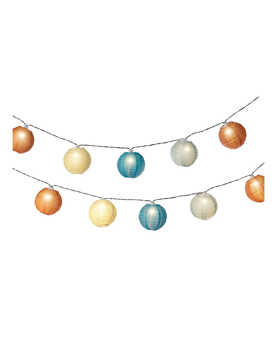 Guirnalda solar de colores de 4,5 m, 10 leds blanco cálido, luz fija 50 cm entre leds. esferas de nylon de ø 7,5 cm. contiene batería 1.2 v. y panel solar 2 v. sin enchufe. duración estimada de batería: 6 h. encendido automático en la oscuridad. con interruptor de encendido. 3 m de cable