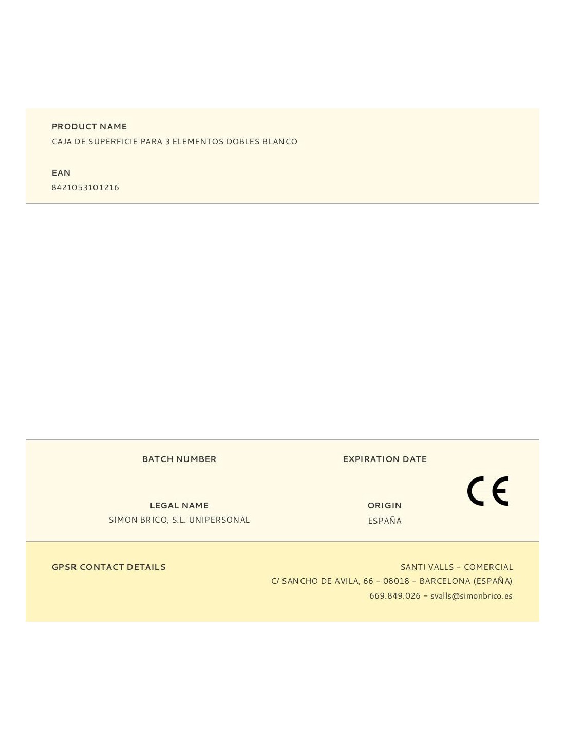 Base caja de superficie para 3 elementos dobles. simon 500 cima blanco, incluye tacos de fijación, tornillería y manual de instalación. dimensiones: 223 x 167 x 50 mm
