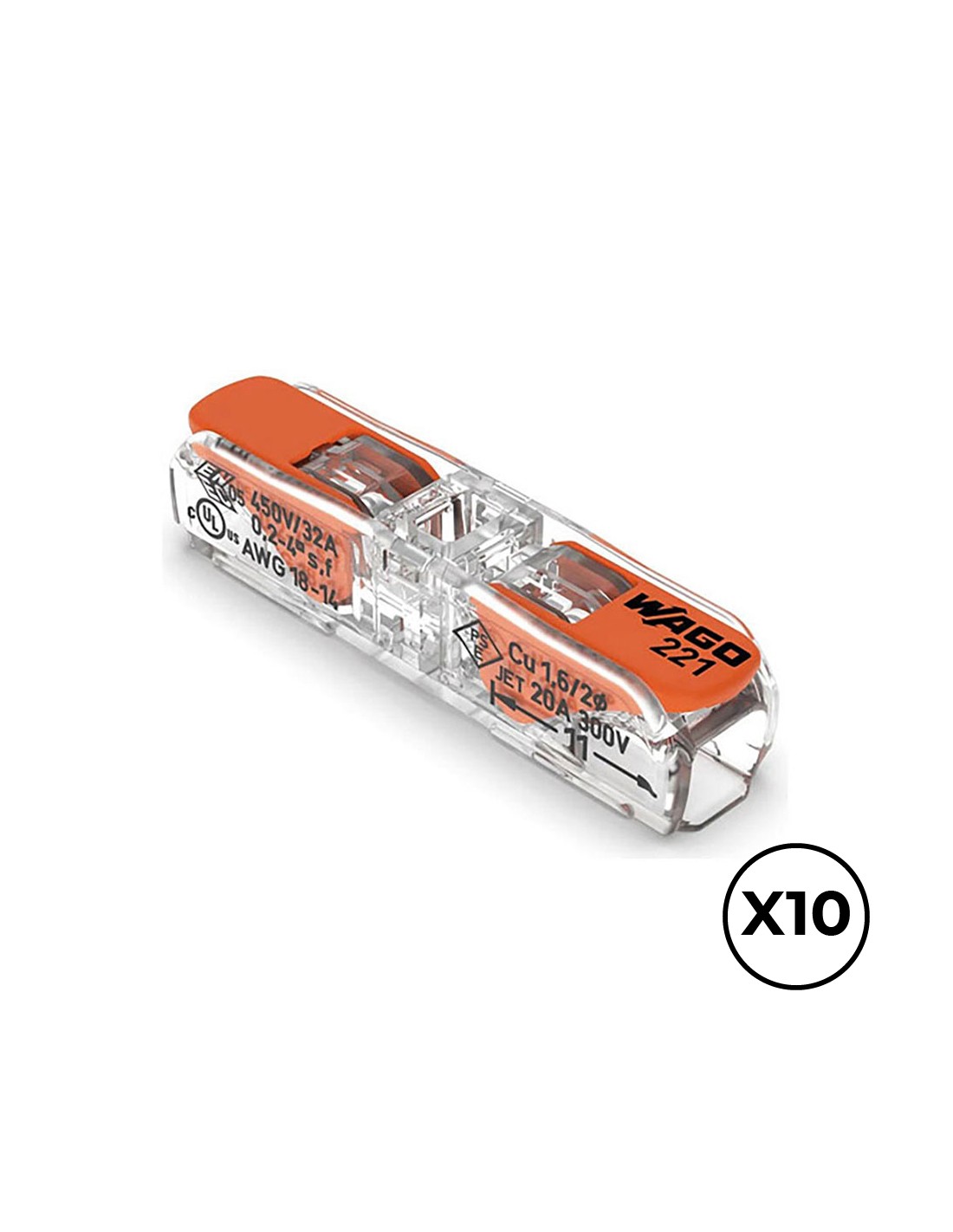 Conector rápido en linea con palanca, para 2 conductores rígidos, semirígidos o flexibles de cobre, diámetro entre 0,5 a 6 mm, 450 v, 32 a temperatura máxima 85°c policarbonato transparente 8,1 x 35,5 x 8,9 mm. contiene 10 unidades
