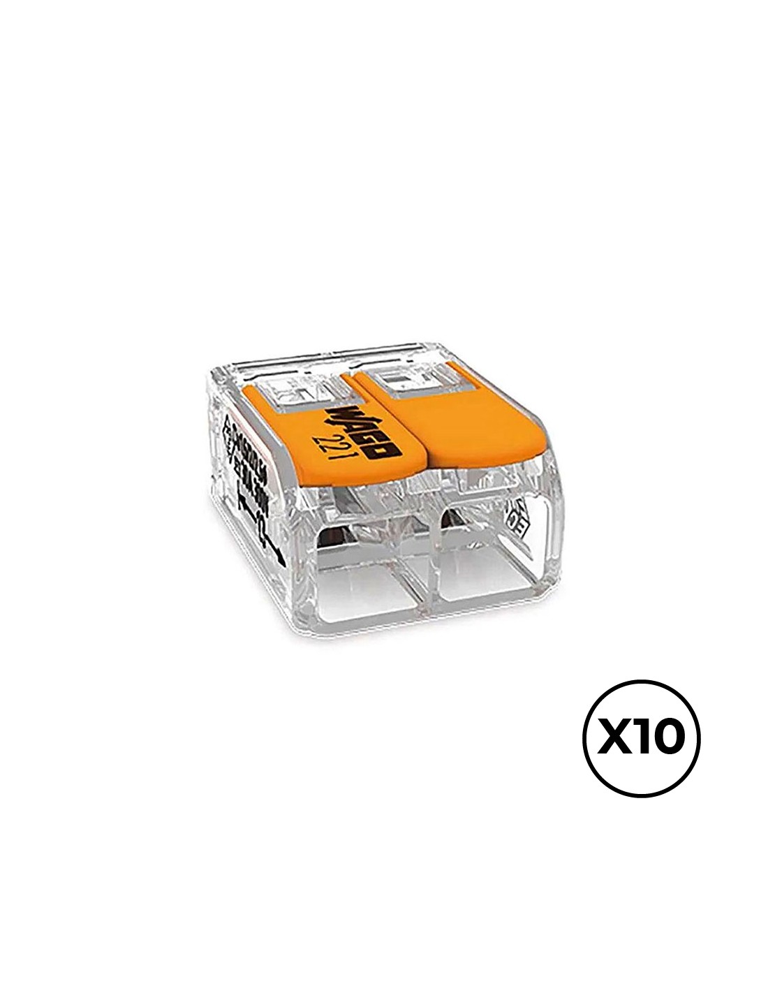 Conector rápido con palanca, para 2 conductores rígidos, semirígidos o flexibles de cobre, diámetro entre 0,5 a 6 mm, 450 v, 41 a temperatura máxima 85°c policarbonato transparente 16 x 21,1 x 10,1 mm. contiene 10 unidades