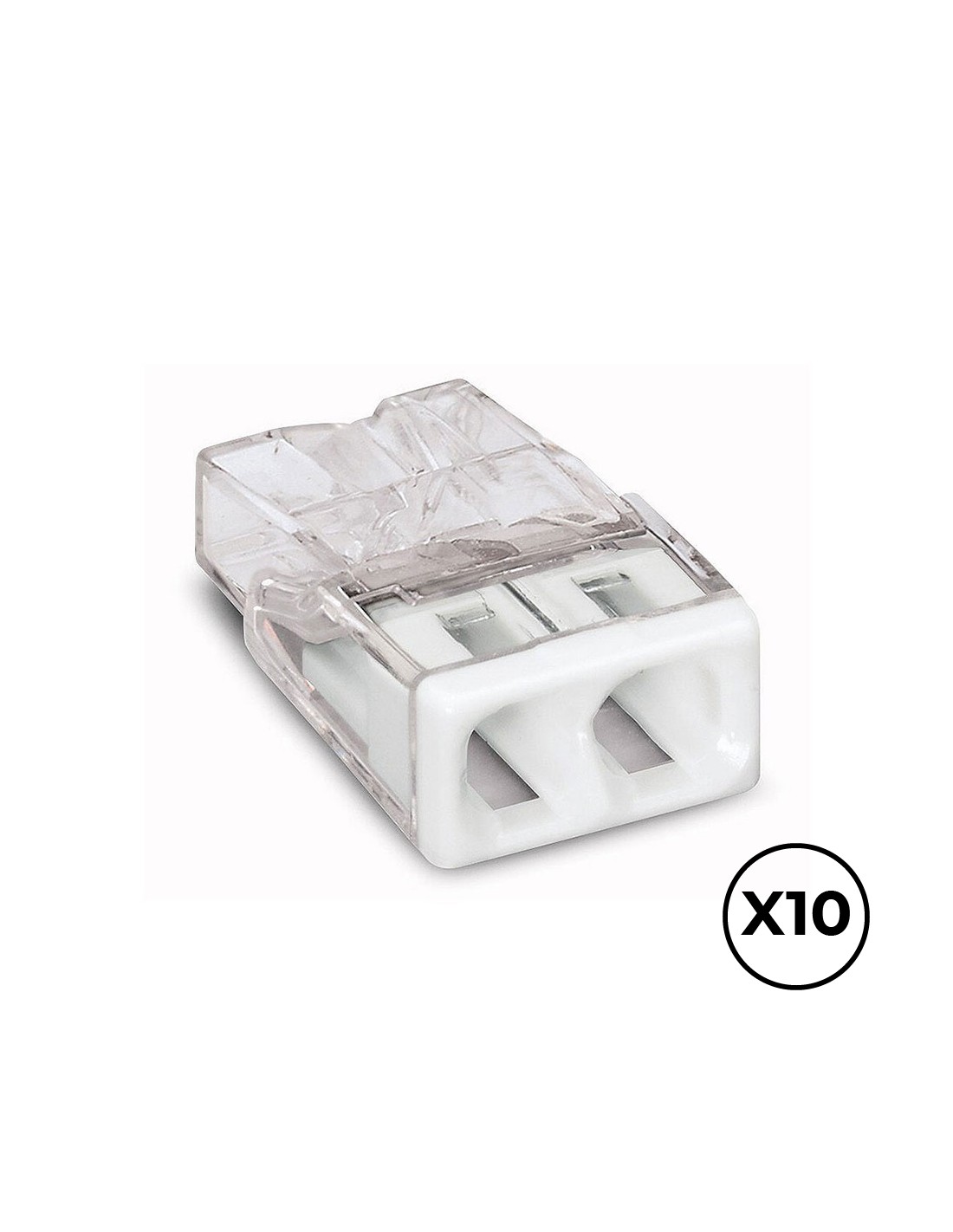 Conector rápido para 2 conductores rígidos de cobre o aluminio, diámetro entre 0,5 a 2,5 mm, 450 v, 24 a temperatura máxima 60°c policarbonato transparente tapa blanca 10 x 16,7 x 5,8 mm. contiene 10 unidades