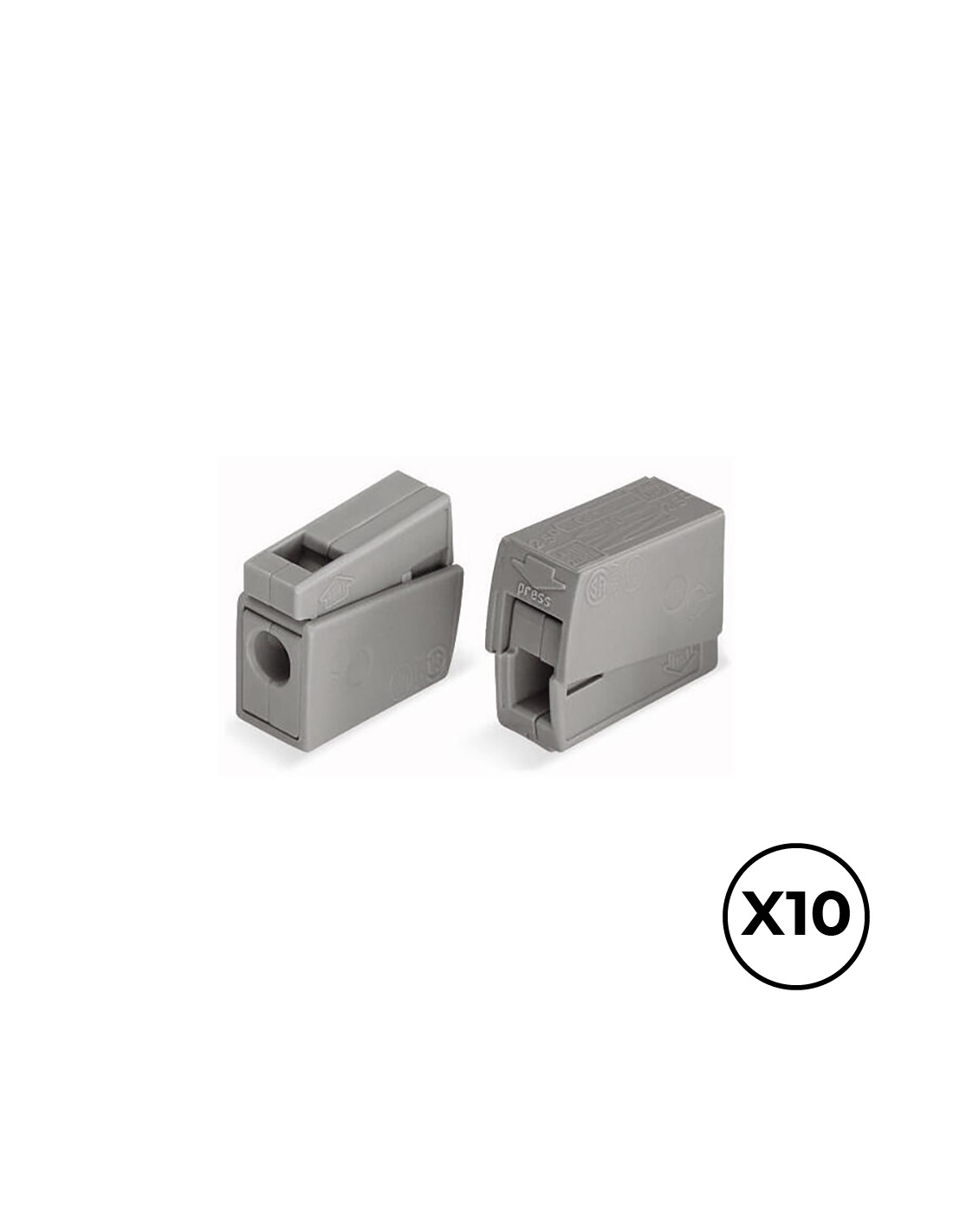 Conector rápido en linea con presilla 2 conductores, 1 rígido + 1 rígido, semirígido o flexible de cobre o aluminio, diámetro entre 0,5 a 2,5 mm, 400 v, 24 a temperatura máxima 60°c gris 8 x 20,4 x 15,5 mm. contiene 10 unidades