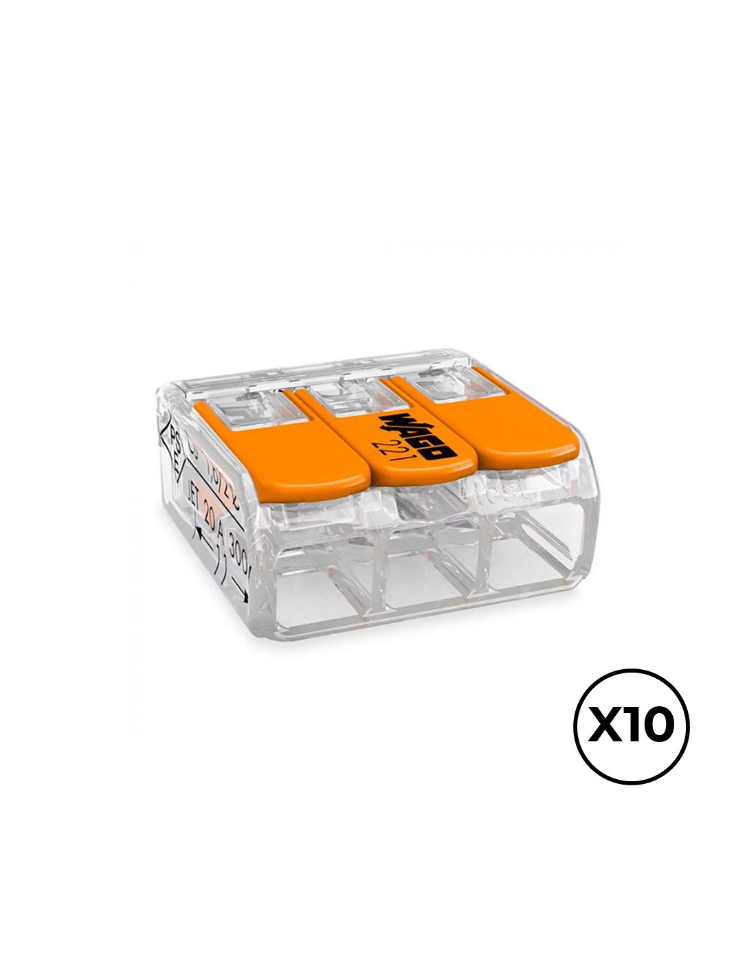 Conector rapido con palanca, para 3 conductores rigidos, semirigidos o flexibles de cobre, diametro entre 0,14 a 4 mm, 450 v, 32 a temperatura maxima 85°c policarbonato transparente 18,8 x 18,6 x 8,4 mm. contiene 10 unidades