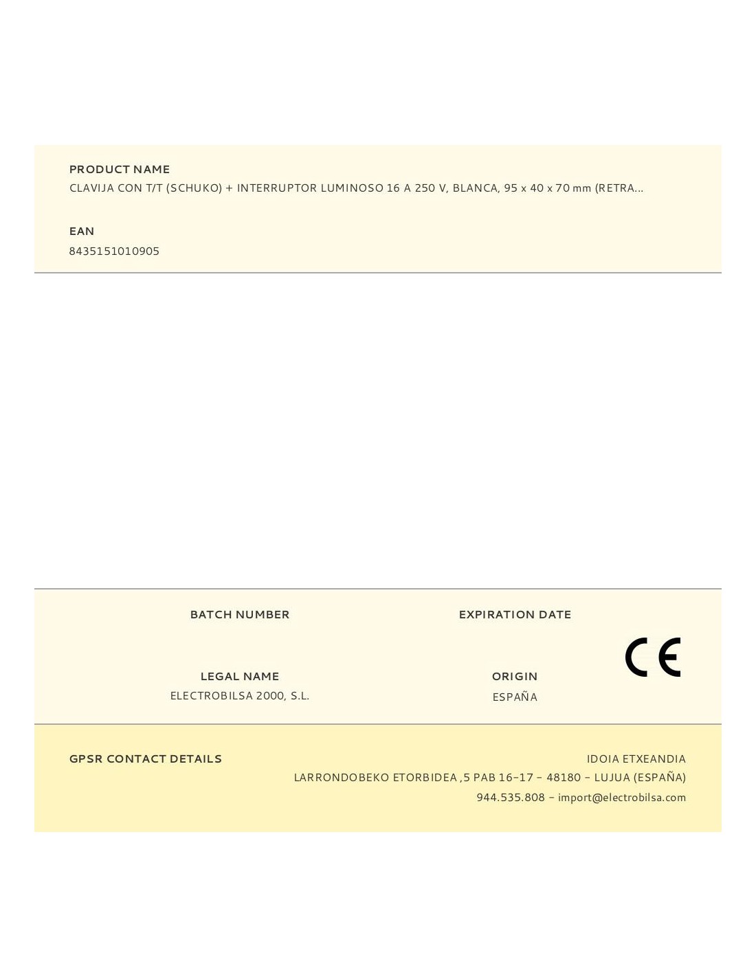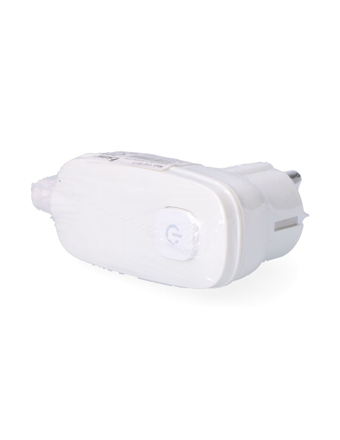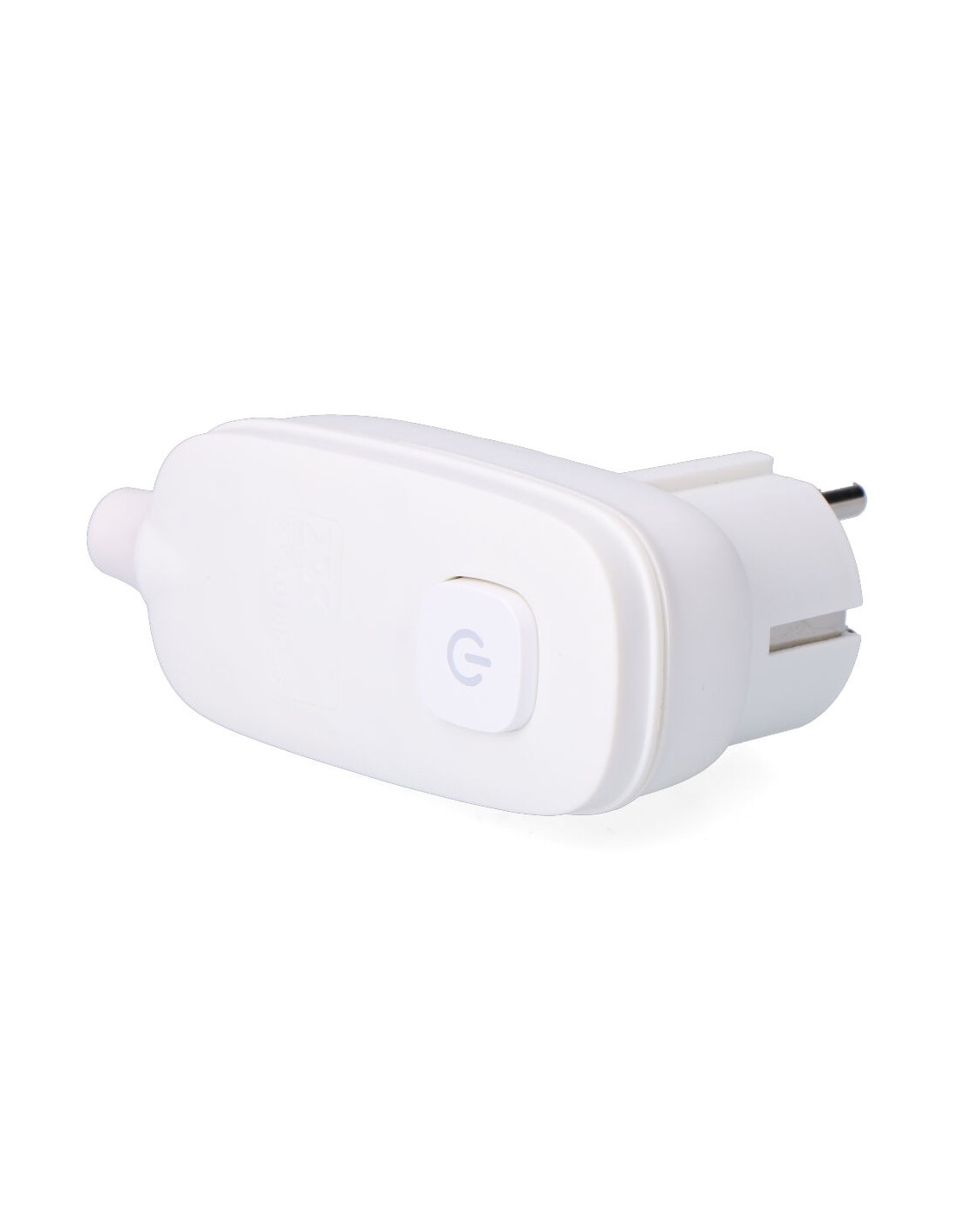 Clavija con t/t tipo schuko + interruptor luminoso, blanca, termoplástica, permite desconectar sin desenchufar la clavija, 95 x 40 x 70 mm (retractilado)
