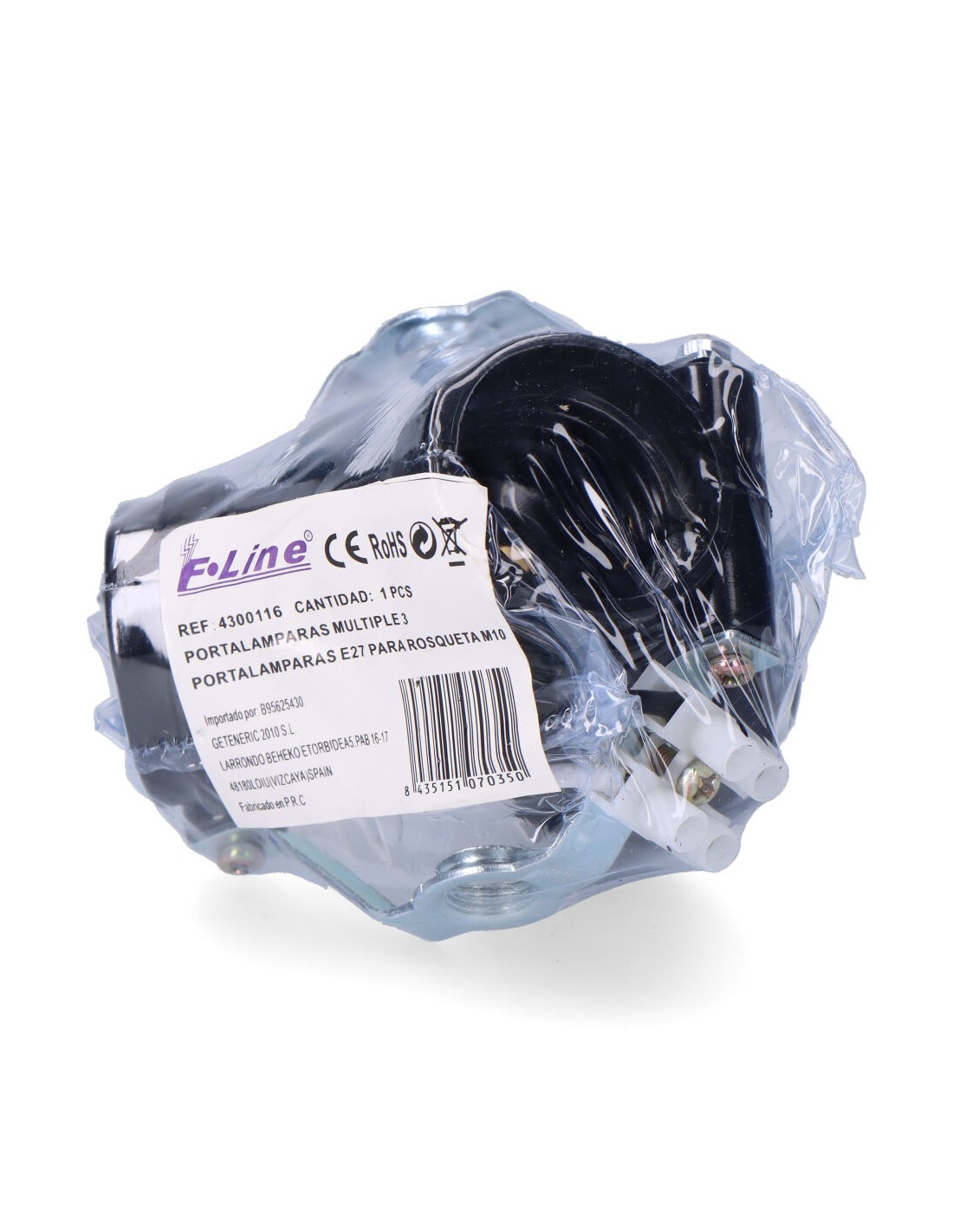 Portalámparas múltiple, tres portalámparas de casquillo e27 para rosca m10, negro. (retractilado)