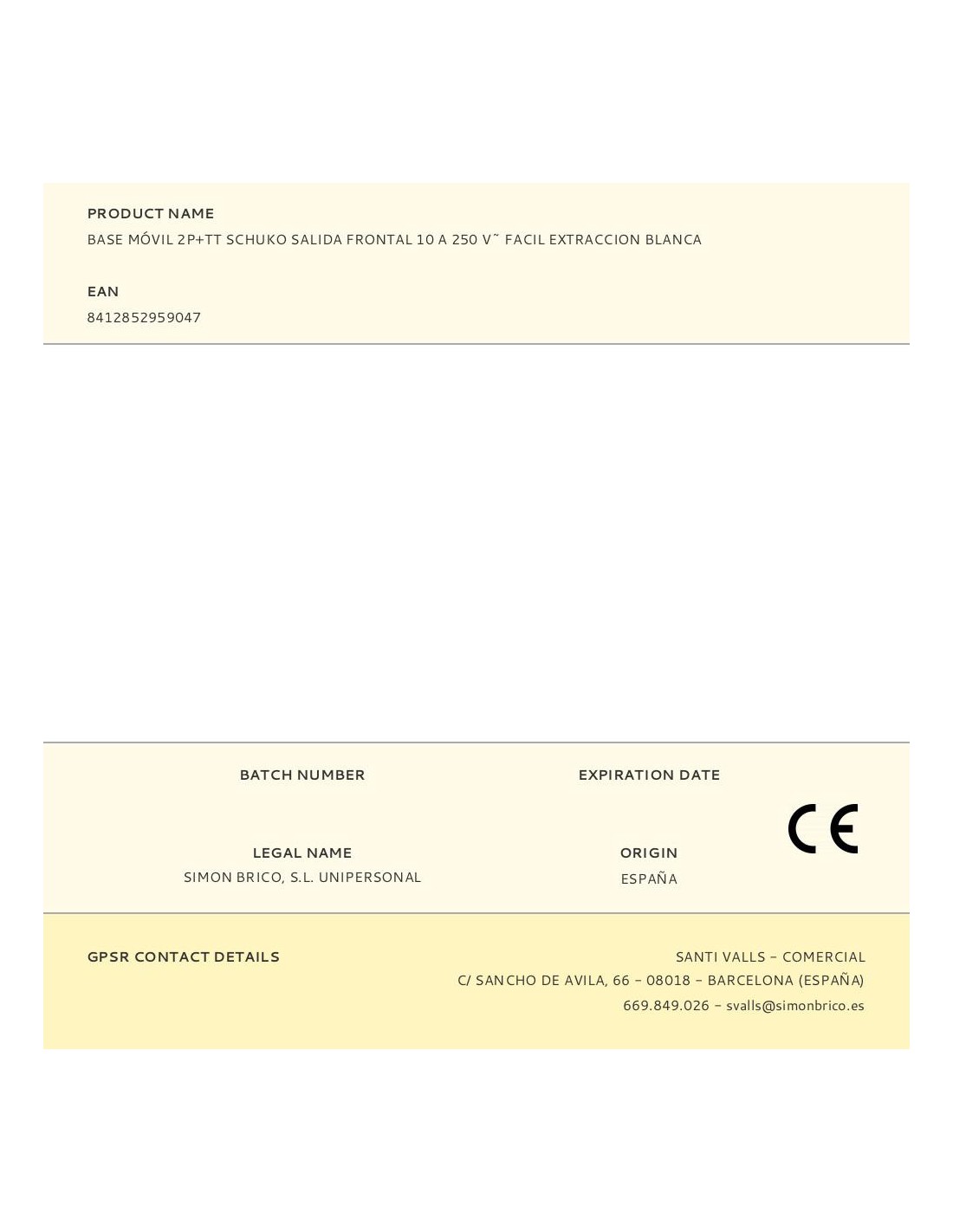 Base móvil 2p+tt schuko salida frontal 10 a 250 v~ facil extracción, blanca