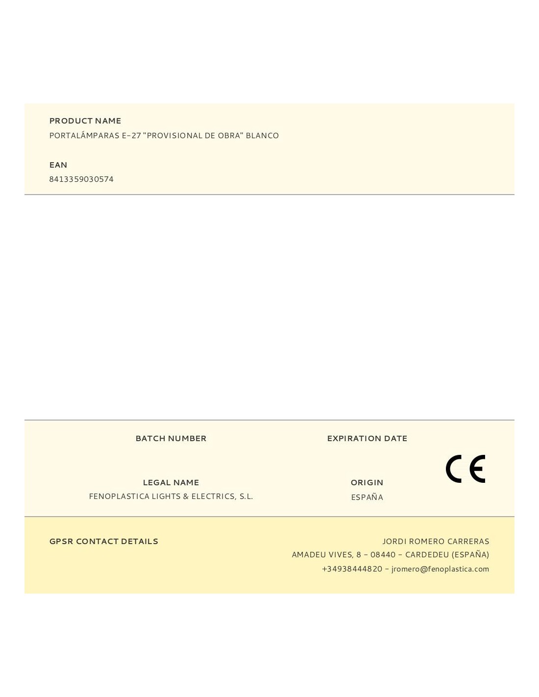 Portalámparas blanco e-27 provisional de obra. 4a 250 v, máximo 60 w. cuerpo de una pieza, conexión sin tornillos, para cable de sección de 0,5 a 2,5 mm. ø38 x 62 mm
