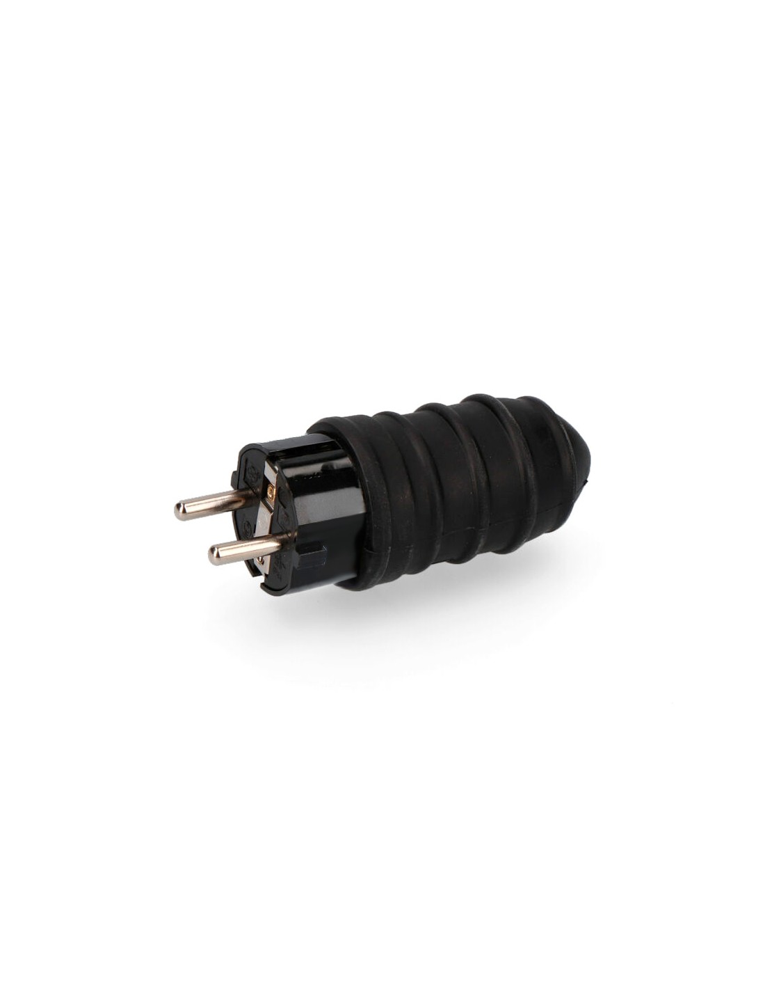 Clavija bipolar de goma negra con toma de tierra lateral y entrada de cable recta. tipo (cee 7/7). ip44, 16a 250v. certificaciones ce, s/n cei 60884-1. dimensiones 114 x ø42 mm