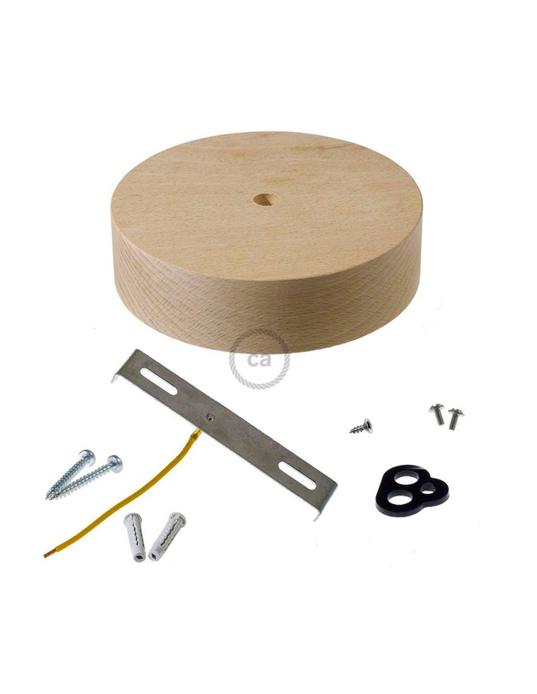 Kit florón madera acabado neutro, ø120 x 32 mm, agujero central de 10 mm, para cable téxtil, tornillería incluida