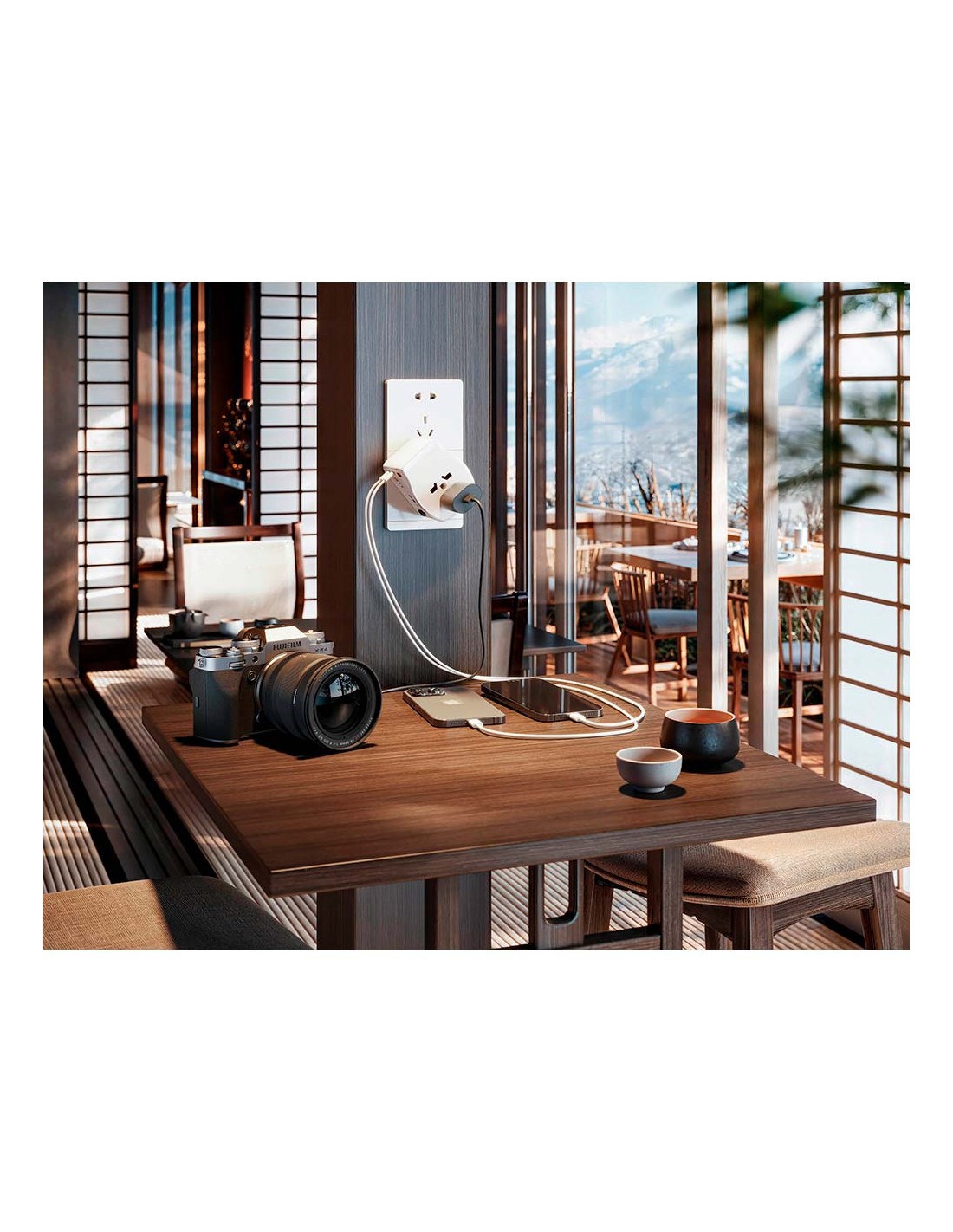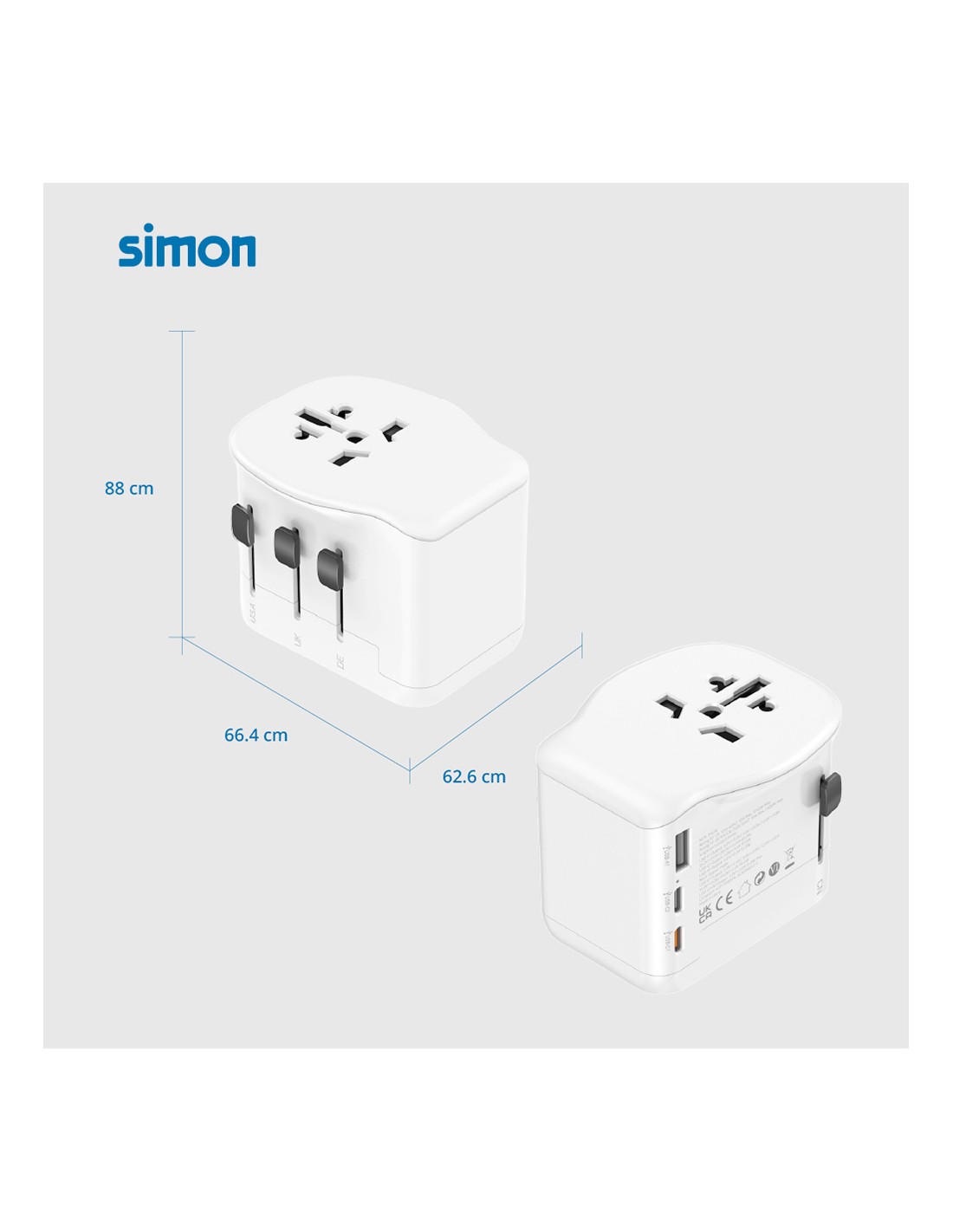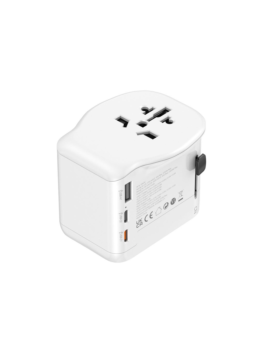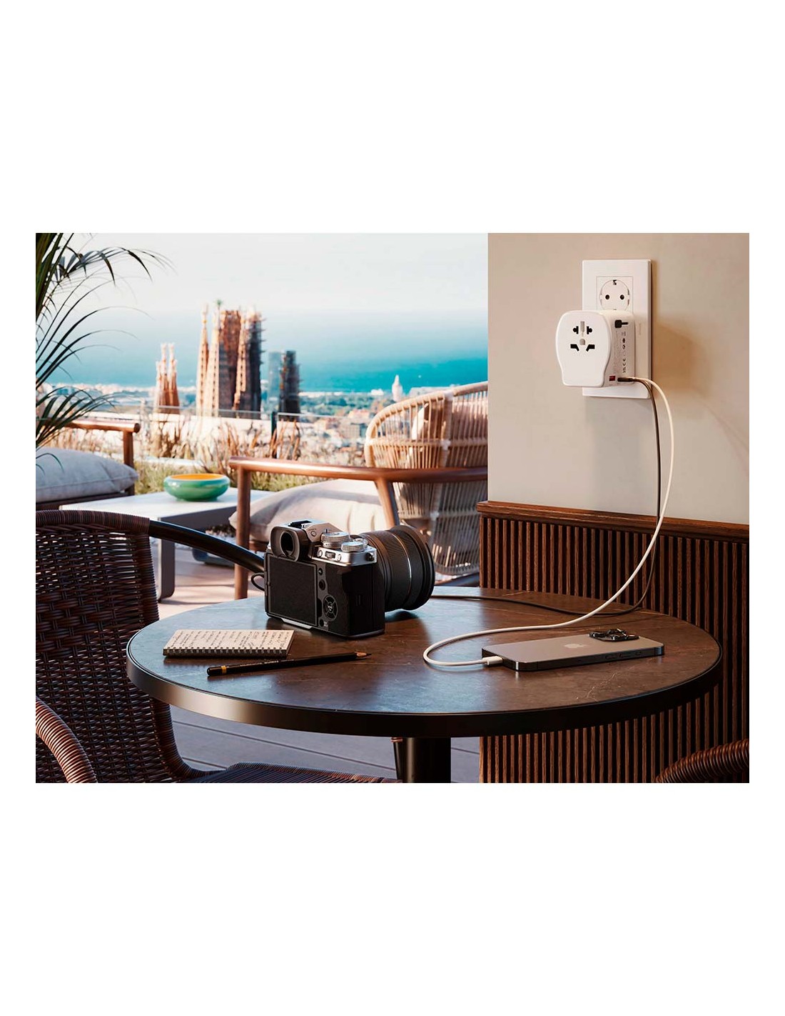 Adaptador viaje universal + 3 usb (1a+2c) 65 w permite viajar a más de 200 paises con carga rápida de 65 w, 1 usb a y 2 usb c, incluye bolsa de viaje