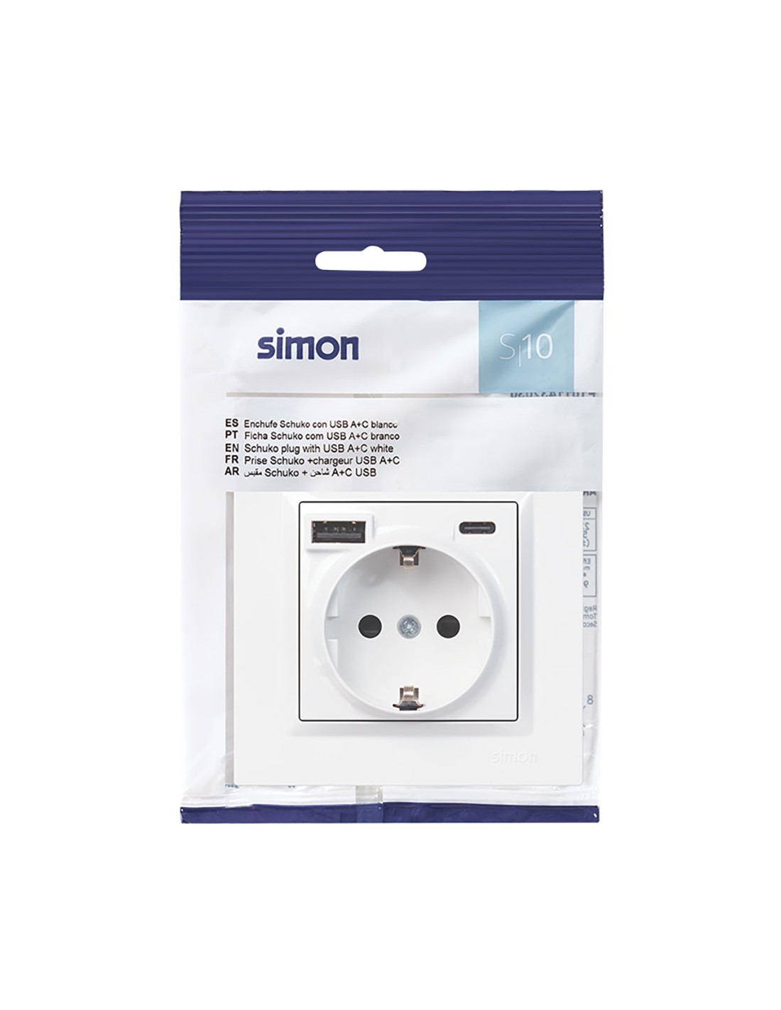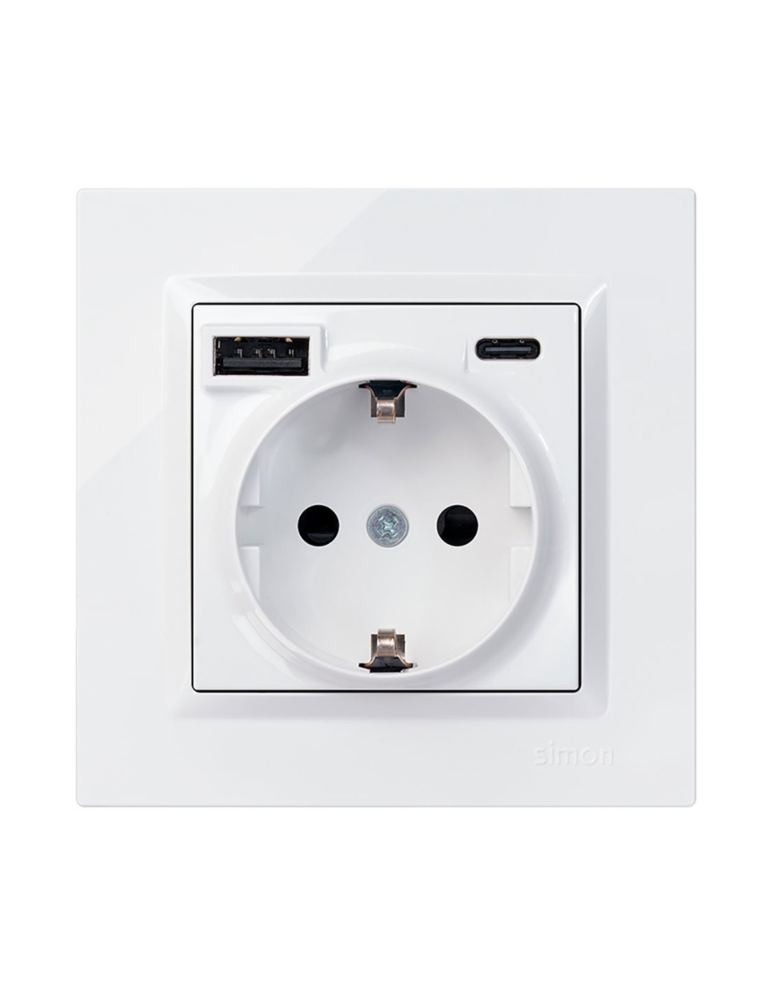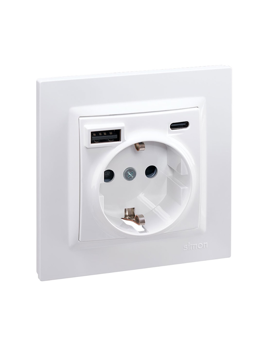 Base enchufe schuko de empotrar 1 toma 16 a + usb a+c 10,5 w serie simon 10, permite conectar aparatos de hasta 16 a y 250 v mientras se cargan móviles u otros dispositivos a través de los puertos usb a y c se compone de mecanismo, tapa y marco bastidor de polipropileno flexible y garras metálicas color blanco