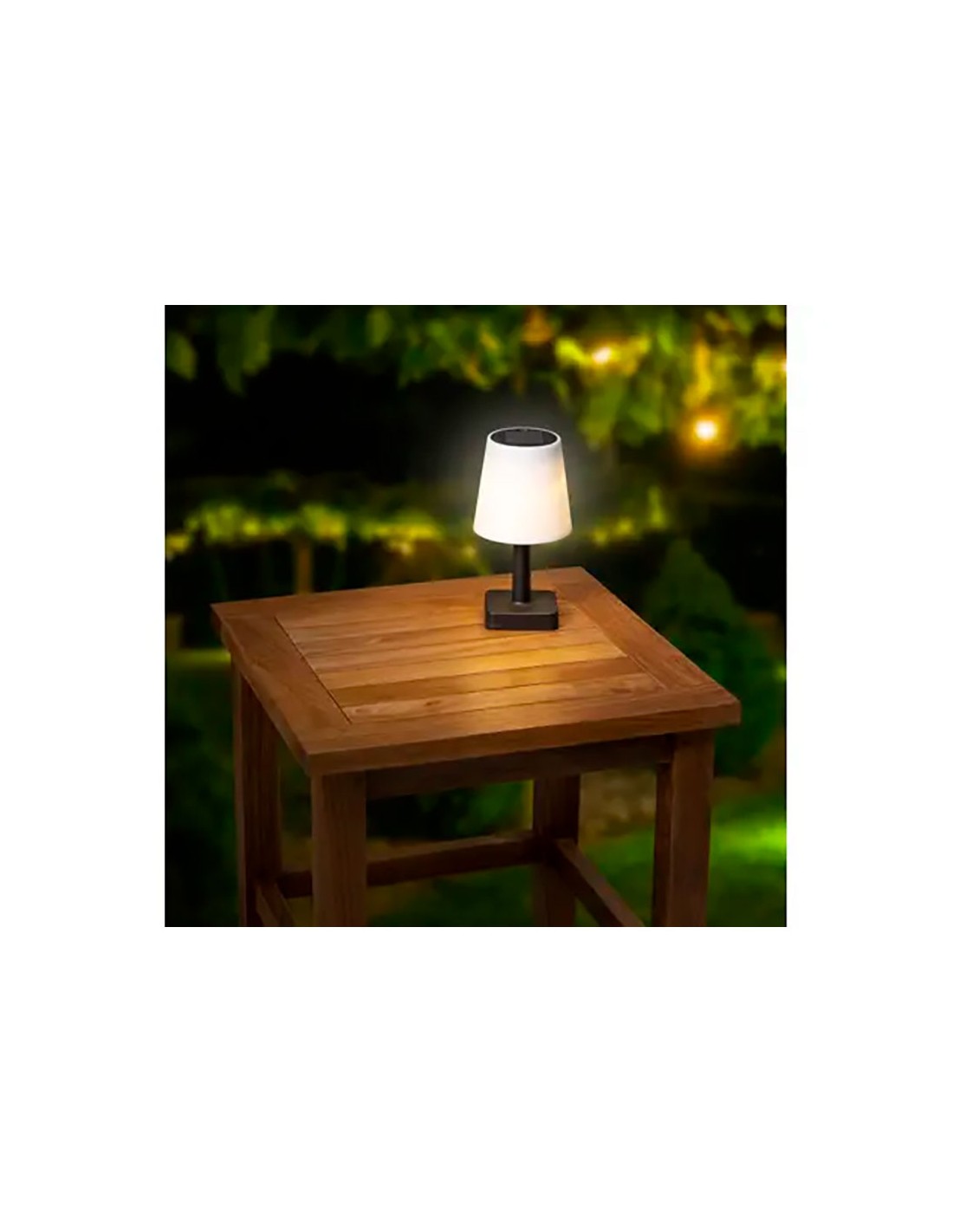 Lámpara solar de sobremesa, 2 w, luz blanca cálida, función fija, con interruptor batería 1,2 v incluida reemplazable 1 x aa ni-mh y panel solar 2 v autonomía 6 h aproximadamente material plástico color negra y blanca dimensiones: ø12 x 23 cm, base: 9 x 9 x 2 cm