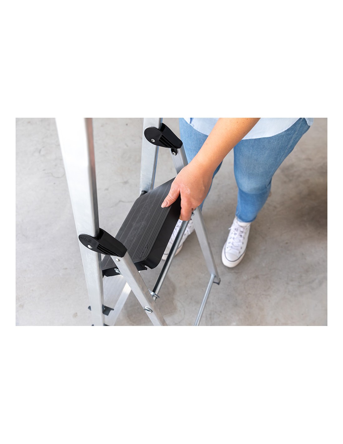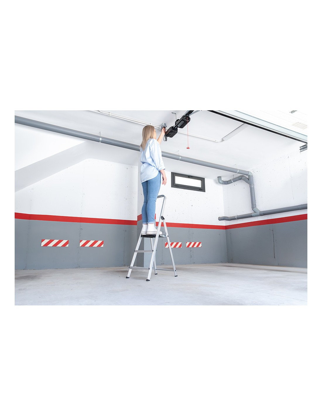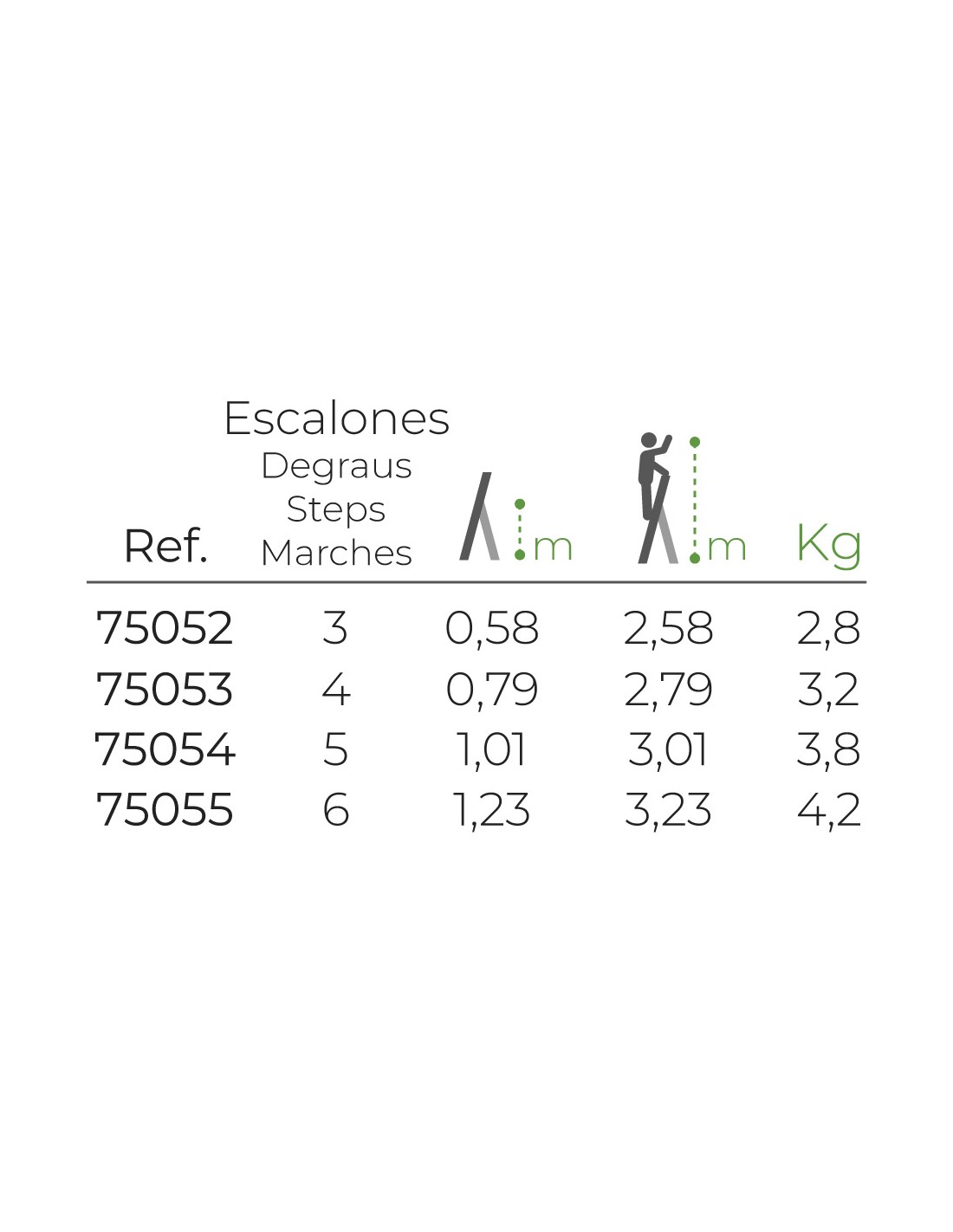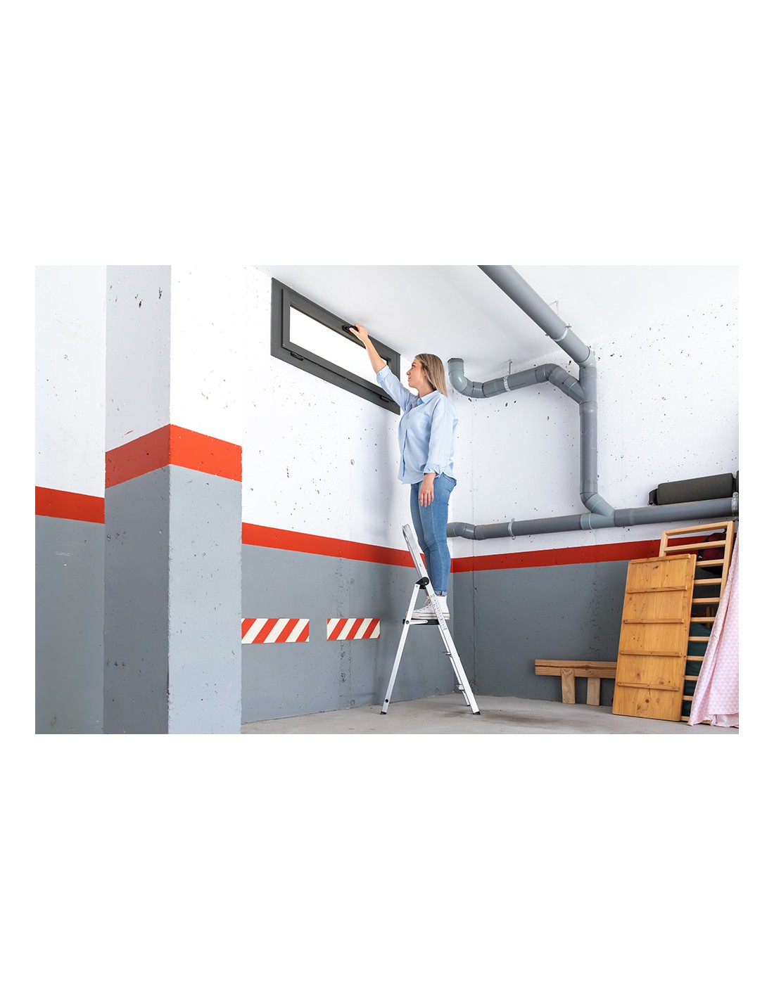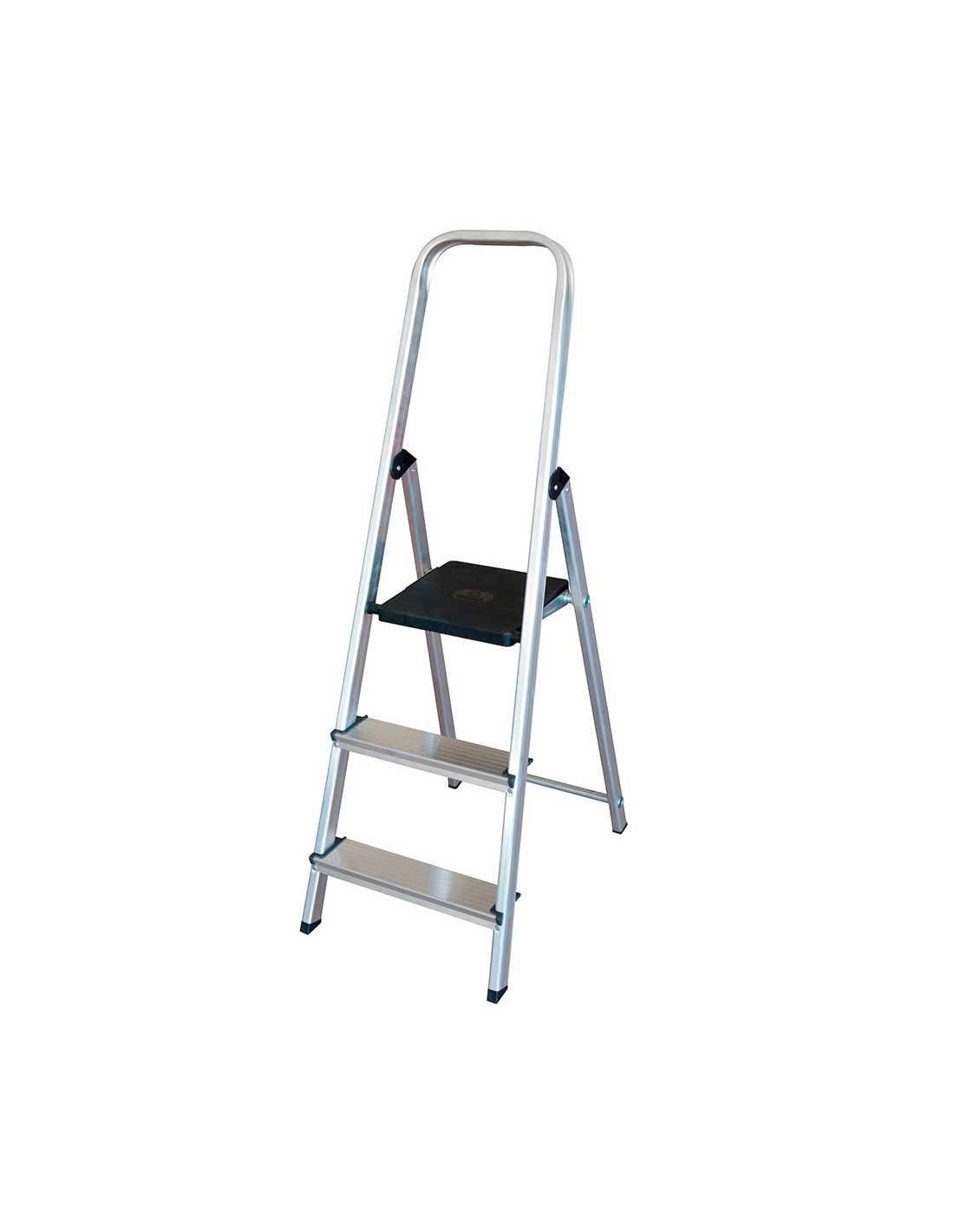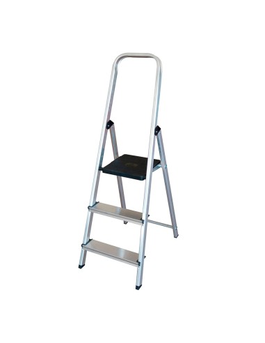 Escalera doméstica de aluminio 3 peldaños. medidas plegada: 41 x 10,5 x 126 cm. altura del último peldaño 58 cm. peso de la escalera: 2,8 kg. peso maximo: 150 kg