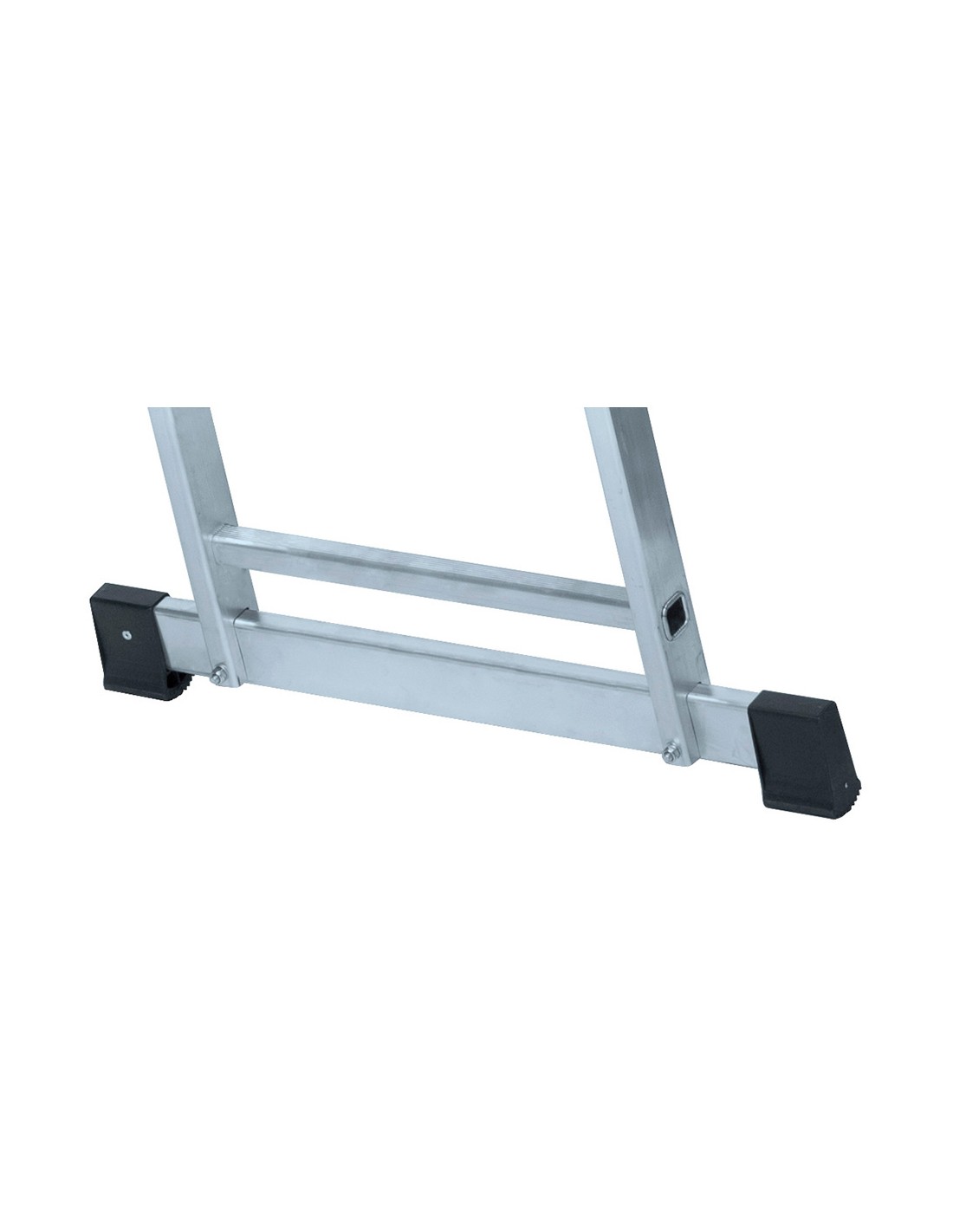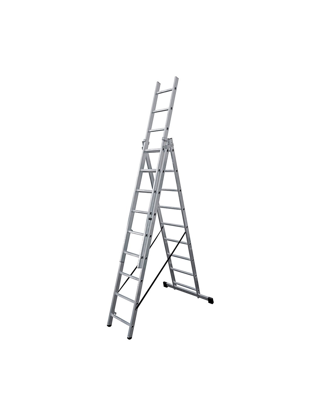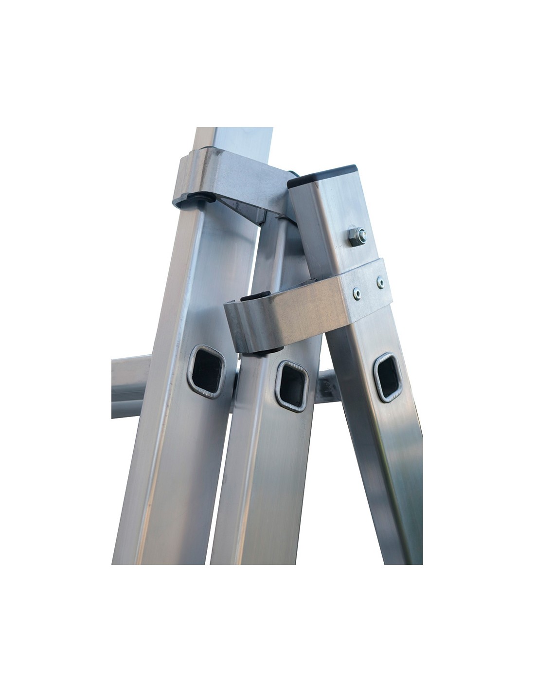 Escalera transformable de aluminio 3 x 9 peldaños. medidas plegadas: 49 x 19 x 255 cm. altura del último paso 5,80 m. peso de la escalera: 13,4 kg. peso máximo: 150 kg. 6,04 m de longitud máxima en uso, sistema de bloqueo de seguridad, guias de deslizamiento en aluminio, base estabilizadora y cinta de seguridad de nylon. en131