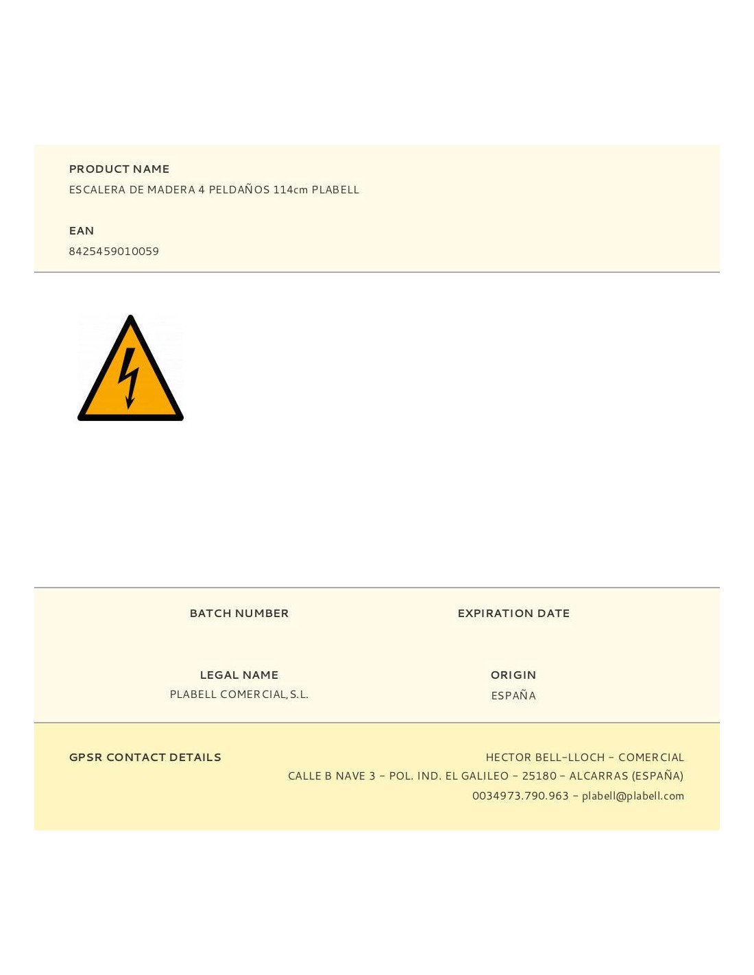 Escalera de madera 4 peldaños 114cm plabell bld-4. especial para pintores y electricistas, de uso exclusivo en tijera y de doble subida. con peldaños anchos, de 6cm, y montantes de sección piramidal sobre su anchura total, alargada progresivamente de arriba hacia la base. en la parte superior, además del sistema anti apertura, los peldaños conforman un tipo de estructura para acoger todo tipo de materiales y recipientes. para asegurarse de la estabiliad de la escalera, se quipa también con tacos de goma antideslizantes y cinta antiapertura. medidas: 114x31/48cm. n peldaños: 4+4. peso escalera: 4kg. garantía 2 años. normativa eu en 131-1-2.
