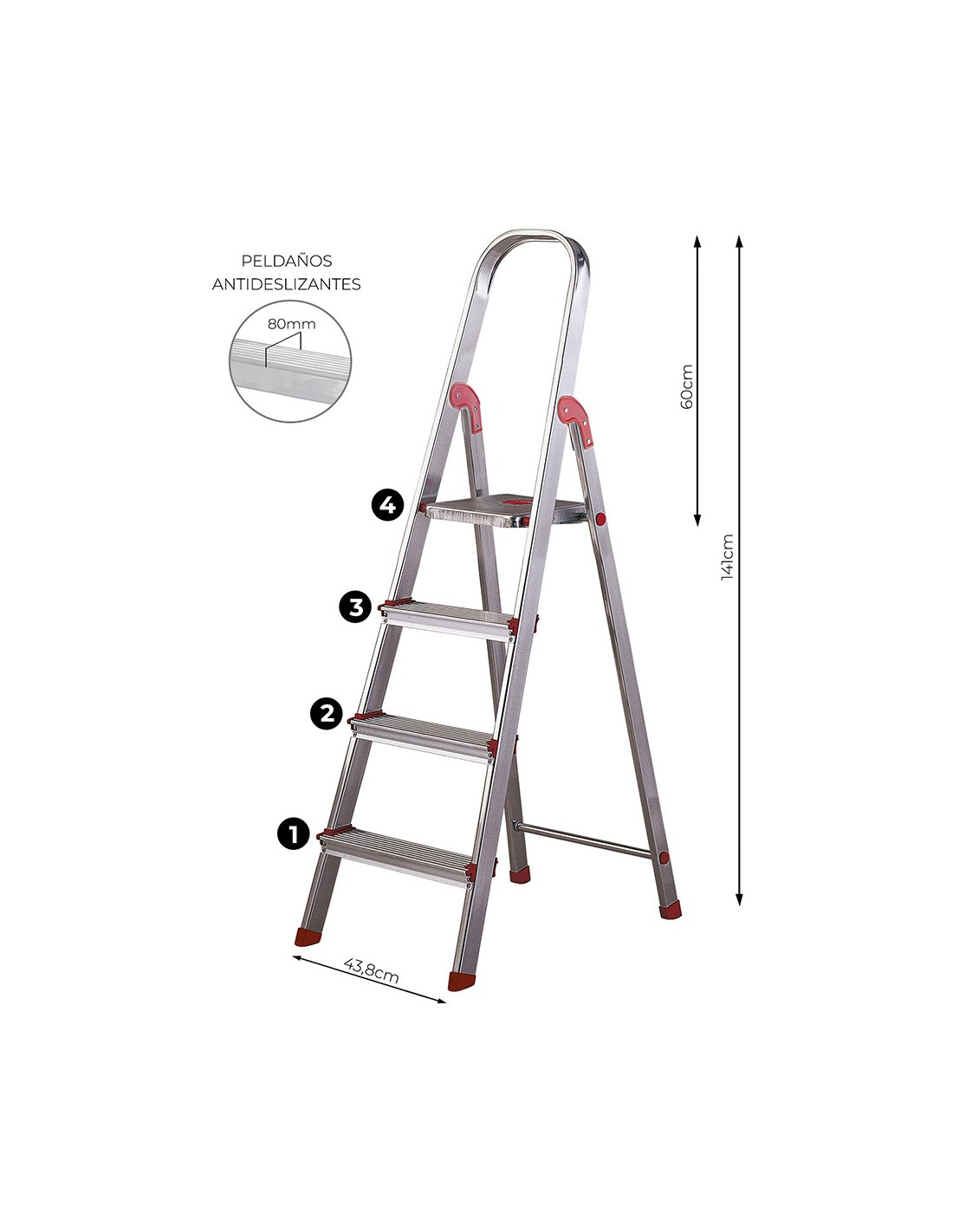Escalera de 4 peldaños, de aluminio. arco de apoyo con altura de seguridad de 60 cm, peldaños antideslizantes y con sistemas de puntos fuertes. rellano con sistema de seguridad y amplia superficie de apoyo. resistencia de carga: 150 kg. altura máxima: 80 cm (hasta plataforma), altura alcanzable 2,80 m. escalera certificada por aenor según norma europea en-131. dimensiones: 43,8 x 11,5 x 151,2 cm