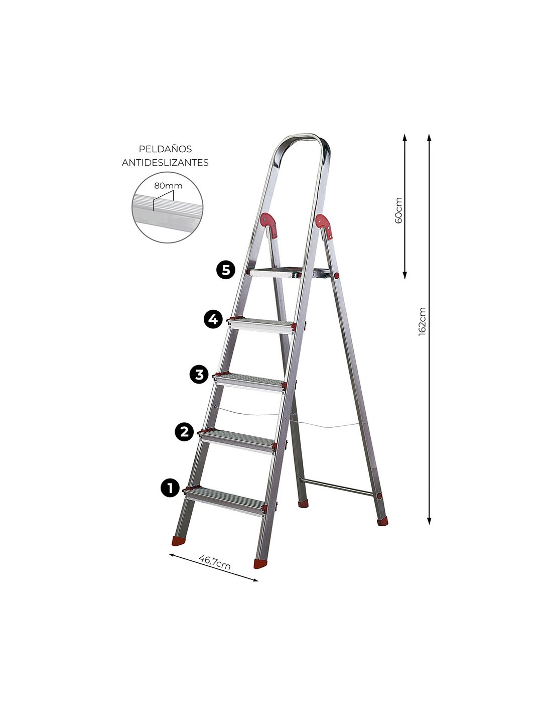 Escalera de 5 peldaños, de aluminio. arco de apoyo con altura de seguridad de 60 cm, peldaños antideslizantes y con sistemas de puntos fuertes, rellano con sistema de seguridad y amplia superficie de apoyo. resistencia de carga: 150 kg. altura máxima: 101 cm (hasta plataforma), altura alcanzable: 3,01 m. escalera certificada por aenor según norma europea en-131. dimensiones: 46,7 x 11,5 x 174,8 cm