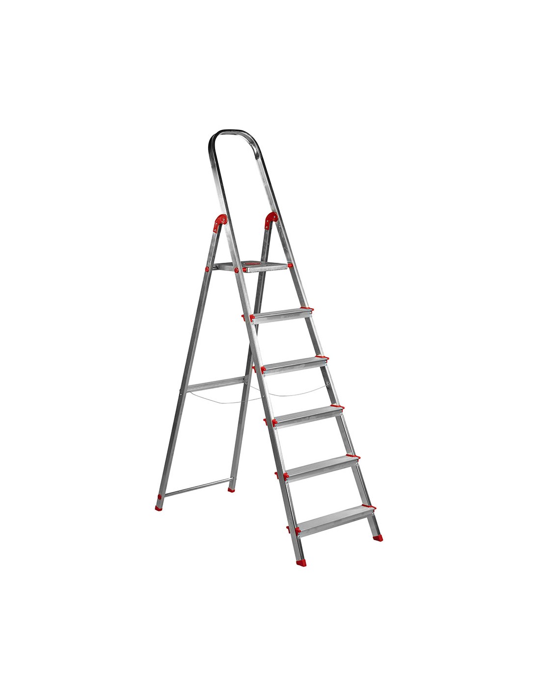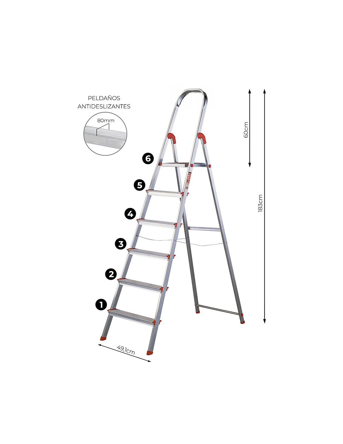 Escalera de 6 peldaños, de aluminio. arco de apoyo con altura de seguridad de 60 cm, peldaños antideslizantes y con sistemas de puntos fuertes, rellano con sistema de seguridad y amplia superficie de apoyo. resistencia de carga: 150 kg. altura máxima: 122 cm (hasta plataforma), altura alcanzable: 3,22 m. escalera certificada por aenor según norma europea en-131. dimensiones: 49,1 x 11,5 x 198 cm
